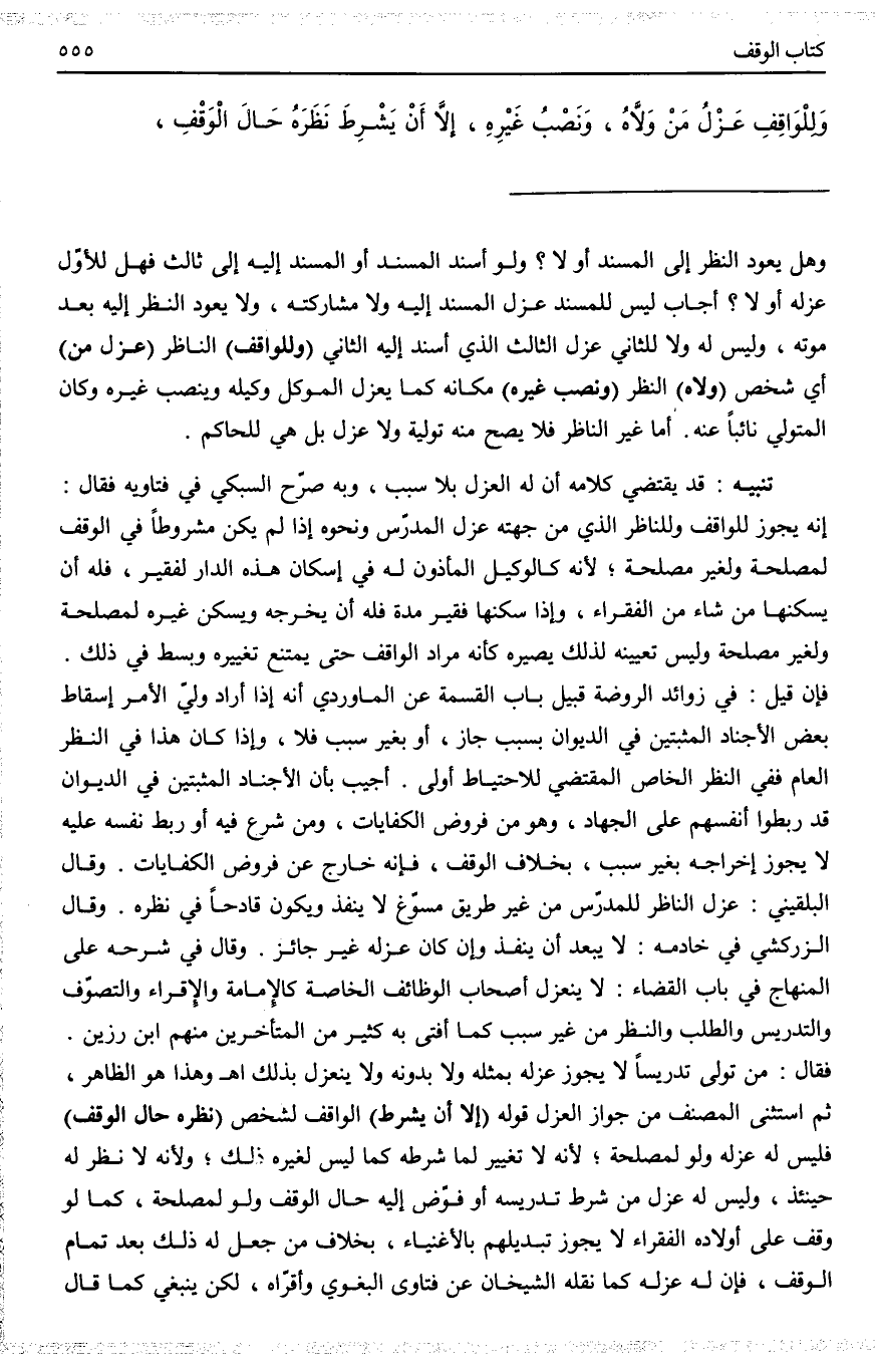 ثُمَّ اسْتَثْنَى الْمُصَنِّفُ مِنْ جَوَازِ الْعَزْلِ قَوْلَهُ (إلَّا أَنْ يَشْرِطَ) الْوَاقِفُ لِشَخْصٍ (نَظَرَهُ حَالَ الْوَقْفِ) فَلَيْسَ لَهُ عَزْلُهُ وَلَوْ لِمَصْلَحَةٍ؛ لِأَنَّهُ لَا تَغْيِيرَ لِمَا شَرَطَهُ كَمَا لَيْسَ لِغَيْرِهِ ذَلِكَ؛ وَلِأَنَّهُ لَا نَظَرَ لَهُ حِينَئِذٍ، وَلَيْسَ لَهُ عَزْلُ مَنْ شَرَطَ تَدْرِيسَهُ أَوْ فَوَّضَ إلَيْهِ حَالَ الْوَقْفِ وَلَوْ لِمَصْلَحَةٍ، كَمَا لَوْ وَقَفَ عَلَى أَوْلَادِهِ الْفُقَرَاءِ لَا يَجُوزُ تَبْدِيلُهُمْ بِالْأَغْنِيَاءِ، بِخِلَافِ مَنْ جَعَلَ لَهُ ذَلِكَ بَعْدَ تَمَامِ الْوَقْفِ، فَإِنَّ لَهُ عَزْلَهُ كَمَا نَقَلَهُ الشَّيْخَانِ عَنْ فَتَاوَى الْبَغَوِيِّ وَأَقَرَّاهُ، لَكِنْ يَنْبَغِي كَمَا قَالَ