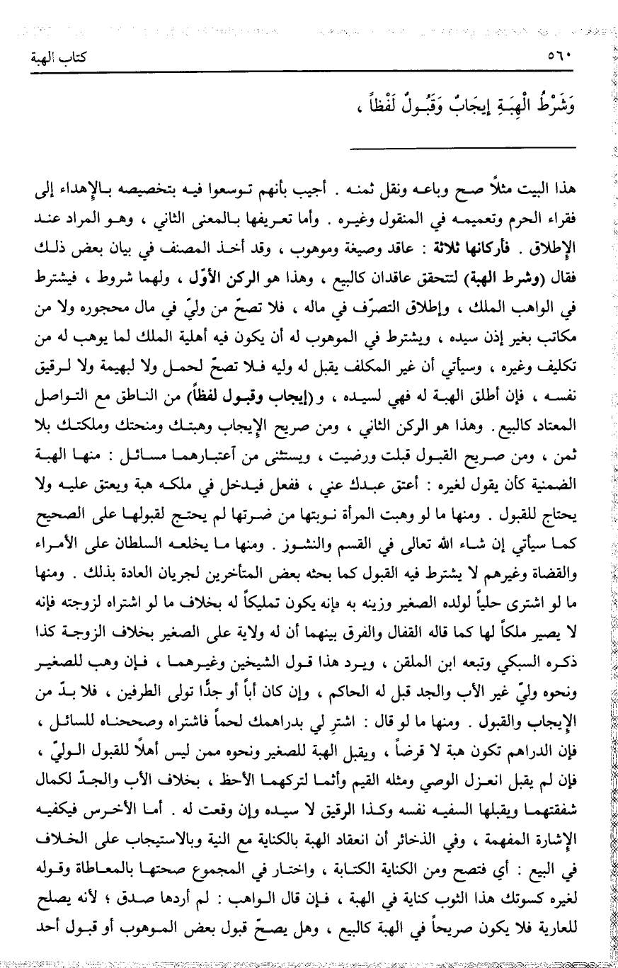 وَأَمَّا تَعْرِيفُهَا بِالْمَعْنَى الثَّانِي، وَهُوَ الْمُرَادُ عِنْدَ الْإِطْلَاقِ. فَأَرْكَانُهَا ثَلَاثَةٌ: عَاقِدٌ وَصِيغَةُ وَمَوْهُوبٌ، وَقَدْ أَخَذَ الْمُصَنِّفُ فِي بَيَانِ بَعْضِ ذَلِكَ فَقَالَ (وَشَرْطُ الْهِبَةِ) لِتَتَحَقَّقَ عَاقِدَانِ كَالْبَيْعِ، وَهَذَا هُوَ الرُّكْنُ الْأَوَّلُ، وَلَهُمَا شُرُوطٌ، فَيُشْتَرَطُ فِي الْوَاهِبِ الْمِلْكُ، وَإِطْلَاقُ التَّصَرُّفِ فِي مَالِهِ، فَلَا تَصِحُّ مِنْ وَلِيٍّ فِي مَالِ مَحْجُورِهِ وَلَا مِنْ مُكَاتَبٍ بِغَيْرِ إذْنِ سَيِّدِهِ، وَيُشْتَرَطُ فِي الْمَوْهُوبِ لَهُ أَنْ يَكُونَ فِيهِ أَهْلِيَّةُ الْمِلْكِ لِمَا يُوهَبُ لَهُ مِنْ تَكْلِيفٍ وَغَيْرِهِ، وَسَيَأْتِي أَنَّ غَيْرَ الْمُكَلَّفِ يَقْبَلُ لَهُ وَلِيُّهُ فَلَا تَصِحُّ لِحَمْلٍ وَلَا لِبَهِيمَةٍ وَلَا لِرَقِيقِ نَفْسِهِ، فَإِنْ أَطْلَقَ الْهِبَةَ لَهُ فَهِيَ لِسَيِّدِهِ، وَ (إيجَابٌ وَقَبُولٌ لَفْظًا) مِنْ النَّاطِقِ مَعَ التَّوَاصُلِ الْمُعْتَادِ كَالْبَيْعِ. وَهَذَا هُوَ الرُّكْنُ الثَّانِي، وَمِنْ صَرِيحِ الْإِيجَابِ وَهَبْتُك وَمَنَحْتُك وَمَلَّكْتُك بِلَا ثَمَنٍ، وَمِنْ صَرِيحِ الْقَبُولِ قَبِلْت وَرَضِيت، وَيُسْتَثْنَى مِنْ اعْتِبَارِهِمَا مَسَائِلُ: مِنْهَا الْهِبَةُ الضِّمْنِيَّةُ كَأَنْ يَقُولَ لِغَيْرِهِ: أَعْتِقْ عَبْدَك عَنِّي، فَفَعَلَ فَيَدْخُلُ فِي مِلْكِهِ هِبَةً وَيُعْتَقُ عَلَيْهِ وَلَا يَحْتَاجُ لِلْقَبُولِ. وَمِنْهَا مَا لَوْ وَهَبَتْ الْمَرْأَةُ نَوْبَتَهَا مِنْ ضَرَّتِهَا لَمْ يُحْتَجْ لِقَبُولِهَا عَلَى الصَّحِيحِ كَمَا سَيَأْتِي إنْ شَاءَ اللَّهُ تَعَالَى فِي الْقَسْمِ وَالنُّشُوزِ. وَمِنْهَا مَا يَخْلَعُهُ السُّلْطَانُ عَلَى الْأُمَرَاءِ وَالْقُضَاةِ وَغَيْرِهِمْ لَا يُشْتَرَطُ فِيهِ الْقَبُولُ كَمَا بَحَثَهُ بَعْضُ الْمُتَأَخِّرِينَ لِجَرَيَانِ الْعَادَةِ بِذَلِكَ. وَمِنْهَا مَا لَوْ اشْتَرَى حُلِيًّا لِوَلَدِهِ الصَّغِيرِ وَزَيَّنَهُ بِهِ فَإِنَّهُ يَكُونُ تَمْلِيكًا لَهُ بِخِلَافِ مَا لَوْ اشْتَرَاهُ لِزَوْجَتِهِ فَإِنَّهُ لَا يَصِيرُ مِلْكًا لَهَا كَمَا قَالَهُ الْقَفَّالُ وَالْفَرْقُ بَيْنَهُمَا أَنَّ لَهُ وِلَايَةً عَلَى الصَّغِيرِ بِخِلَافِ الزَّوْجَةِ كَذَا ذَكَرَهُ السُّبْكِيُّ وَتَبِعَهُ ابْنُ الْمُلَقَّنِ، وَيَرُدُّ هَذَا قَوْلُ الشَّيْخَيْنِ وَغَيْرِهِمَا، فَإِنْ وَهَبَ لِلصَّغِيرِ وَنَحْوِهِ وَلِيٌّ غَيْرُ الْأَبِ وَالْجَدِّ قَبِلَ لَهُ الْحَاكِمُ، وَإِنْ كَانَ أَبًا أَوْ جَدًّا تَوَلَّى الطَّرَفَيْنِ، فَلَا بُدَّ مِنْ الْإِيجَابِ وَالْقَبُولِ. وَمِنْهَا مَا لَوْ قَالَ: اشْتَرِ لِي بِدَرَاهِمِك لَحْمًا فَاشْتَرَاهُ وَصَحَّحْنَاهُ لِلسَّائِلِ، فَإِنَّ الدَّرَاهِمَ تَكُونُ هِبَةً لَا قَرْضًا، وَيَقْبَلُ الْهِبَةَ لِلصَّغِيرِ وَنَحْوِهِ مِمَّنْ لَيْسَ أَهْلًا لِلْقَبُولِ الْوَلِيُّ، فَإِنْ لَمْ يَقْبَلْ انْعَزَلَ الْوَصِيُّ وَمِثْلُهُ الْقَيِّمُ وَأَثِمَا لِتَرْكِهِمَا الْأَحَظَّ، بِخِلَافِ الْأَبِ وَالْجَدِّ لِكَمَالِ شَفَقَتِهِمَا وَيَقْبَلُهَا السَّفِيهُ نَفْسُهُ وَكَذَا الرَّقِيقُ لَا سَيِّدُهُ وَإِنْ وَقَعَتْ لَهُ. أَمَّا الْأَخْرَسُ فَيَكْفِيهِ الْإِشَارَةُ الْمُفْهِمَةُ، وَفِي الذَّخَائِرِ أَنَّ انْعِقَادَ الْهِبَةِ بِالْكِنَايَةِ مَعَ النِّيَّةِ وَبِالِاسْتِيجَابِ عَلَى الْخِلَافِ فِي الْبَيْعِ: أَيْ فَتَصِحُّ وَمِنْ الْكِنَايَةِ الْكِتَابَةُ، وَاخْتَارَ فِي الْمَجْمُوعِ صِحَّتَهَا بِالْمُعَاطَاةِ وَقَوْلُهُ لِغَيْرِهِ كَسَوْتُك هَذَا الثَّوْبَ كِنَايَةٌ فِي الْهِبَةِ، فَإِنْ قَالَ الْوَاهِبُ: لَمْ أُرِدْهَا صَدَقَ؛ لِأَنَّهُ يَصْلُحُ لِلْعَارِيَّةِ فَلَا يَكُونُ صَرِيحًا ف