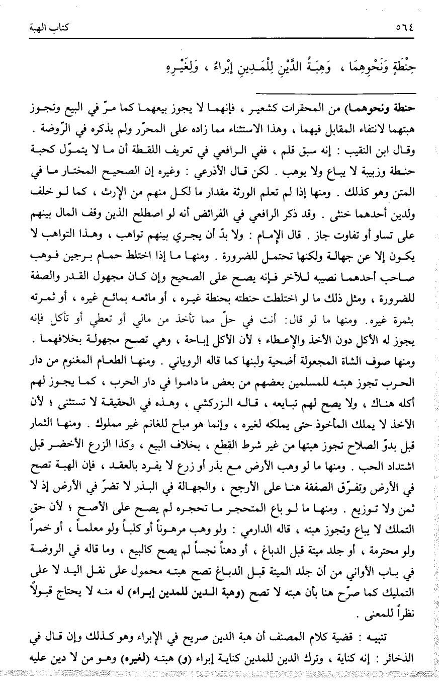 وَمِنْهَا مَا لَوْ وَهَبَ الْأَرْضَ مَعَ بَذْرٍ أَوْ زَرْعٍ لَا يُفَرَّدُ بِالْعَقْدِ، فَإِنَّ الْهِبَةَ تَصِحُّ فِي الْأَرْضِ وَتُفَرَّقُ الصَّفْقَةُ هُنَا عَلَى الْأَرْجَحِ، وَالْجَهَالَةُ فِي الْبَذْرِ لَا تَضُرُّ فِي الْأَرْضِ إذْ لَا ثَمَنَ وَلَا تَوْزِيعَ. وَمِنْهَا مَا لَوْ بَاعَ الْمُتَحَجِّرُ مَا تَحَجَّرَهُ لَمْ يَصِحَّ عَلَى الْأَصَحِّ؛ لِأَنَّ حَقَّ التَّمَلُّكِ لَا يُبَاعُ وَتَجُوزُ هِبَتُهُ، قَالَهُ الدَّارِمِيُّ: وَلَوْ وَهَبَ مَرْهُونًا أَوْ كَلْبًا وَلَوْ مُعَلَّمًا، أَوْ خَمْرًا وَلَوْ مُحْتَرَمَةً، أَوْ جِلْدَ مَيْتَةٍ قَبْلَ الدِّبَاغِ، أَوْ دُهْنًا نَجِسًا لَمْ يَصِحَّ كَالْبَيْعِ، وَمَا قَالَهُ فِي الرَّوْضَةِ فِي بَابِ الْأَوَانِي مِنْ أَنَّ جِلْدَ الْمَيْتَةِ قَبْلَ الدِّبَاغِ تَصِحُّ هِبَتُهُ مَحْمُولٌ عَلَى نَقْلِ الْيَدِ لَا عَلَى التَّمْلِيكِ كَمَا صَرَّحَ هُنَا بِأَنَّ هِبَتَهُ لَا تَصِحُّ.