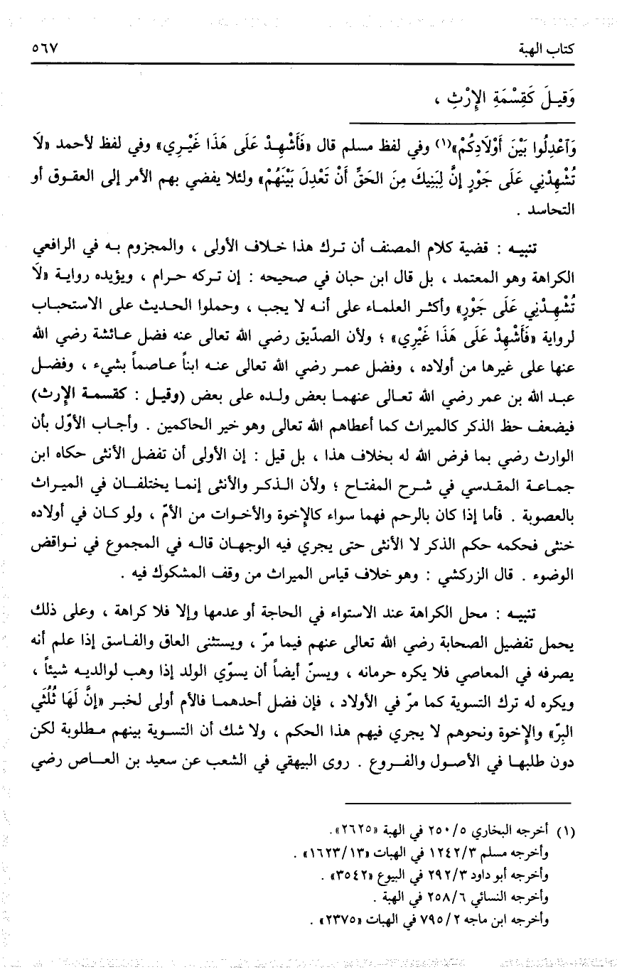 تَنْبِيهٌ قَضِيَّةُ كَلَامِ الْمُصَنِّفِ أَنَّ تَرْكَ هَذَا خِلَافُ الْأَوْلَى، وَالْمَجْزُومُ بِهِ فِي الرَّافِعِيِّ الْكَرَاهَةُ وَهُوَ الْمُعْتَمَدُ، بَلْ قَالَ ابْنُ حِبَّانَ فِي صَحِيحِهِ: إنَّ تَرْكَهُ حَرَامٌ، وَيُؤَيِّدُهُ رِوَايَةُ " لَا تُشْهِدْنِي عَلَى جَوْرٍ " وَأَكْثَرُ الْعُلَمَاءِ عَلَى أَنَّهُ لَا يَجِبُ، وَحَمَلُوا الْحَدِيثَ عَلَى الِاسْتِحْبَابِ لِرِوَايَةِ «فَأَشْهِدْ عَلَى هَذَا غَيْرِي» ؛ وَلِأَنَّ الصِّدِّيقَ - رَضِيَ اللَّهُ تَعَالَى عَنْهُ - فَضَّلَ عَائِشَةَ - رَضِيَ اللَّهُ عَنْهَا - عَلَى غَيْرِهَا مِنْ أَوْلَادِهِ، وَفَضَّلَ عُمَرُ - رَضِيَ اللَّهُ تَعَالَى عَنْهُ - ابْنًا عَاصِمًا بِشَيْءٍ، وَفَضَّلَ عَبْدُ اللَّهِ بْنُ عُمَرَ - رَضِيَ اللَّهُ تَعَالَى عَنْهُمَا - بَعْضَ وَلَدِهِ عَلَى بَعْضٍ (وَقِيلَ: كَقِسْمَةِ الْإِرْثِ) فَيُضَعَّفُ حَظُّ الذَّكَرِ كَالْمِيرَاثِ كَمَا أَعْطَاهُمْ اللَّهُ تَعَالَى وَهُوَ خَيْرُ الْحَاكِمِينَ.