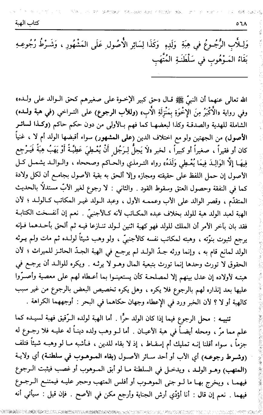 (وَلِلْأَبِ الرُّجُوعُ) عَلَى التَّرَاخِي (فِي هِبَةِ وَلَدِهِ) الشَّامِلَةِ لِلْهَدِيَّةِ وَالصَّدَقَةِ وَكَذَا لِبَعْضِهَا كَمَا فُهِمَ بِالْأُولَى مِنْ دُونِ حُكْمِ حَاكِمٍ (وَكَذَا لِسَائِرِ الْأُصُولِ) مِنْ الْجِهَتَيْنِ وَلَوْ مَعَ اخْتِلَافِ الدِّينِ (عَلَى الْمَشْهُورِ) سَوَاءٌ أَقَبَضَهَا الْوَلَدُ أَمْ لَا، غَنِيًّا كَانَ أَوْ فَقِيرًا، صَغِيرًا أَوْ كَبِيرًا، لِخَبَرِ «لَا يَحِلُّ لِرَجُلٍ أَنْ يُعْطِيَ عَطِيَّةً أَوْ يَهَبَ هِبَةً فَيَرْجِعَ فِيهَا إلَّا الْوَالِدَ فِيمَا يُعْطِي وَلَدَهُ» رَوَاهُ التِّرْمِذِيُّ وَالْحَاكِمُ وَصَحَّحَاهُ.