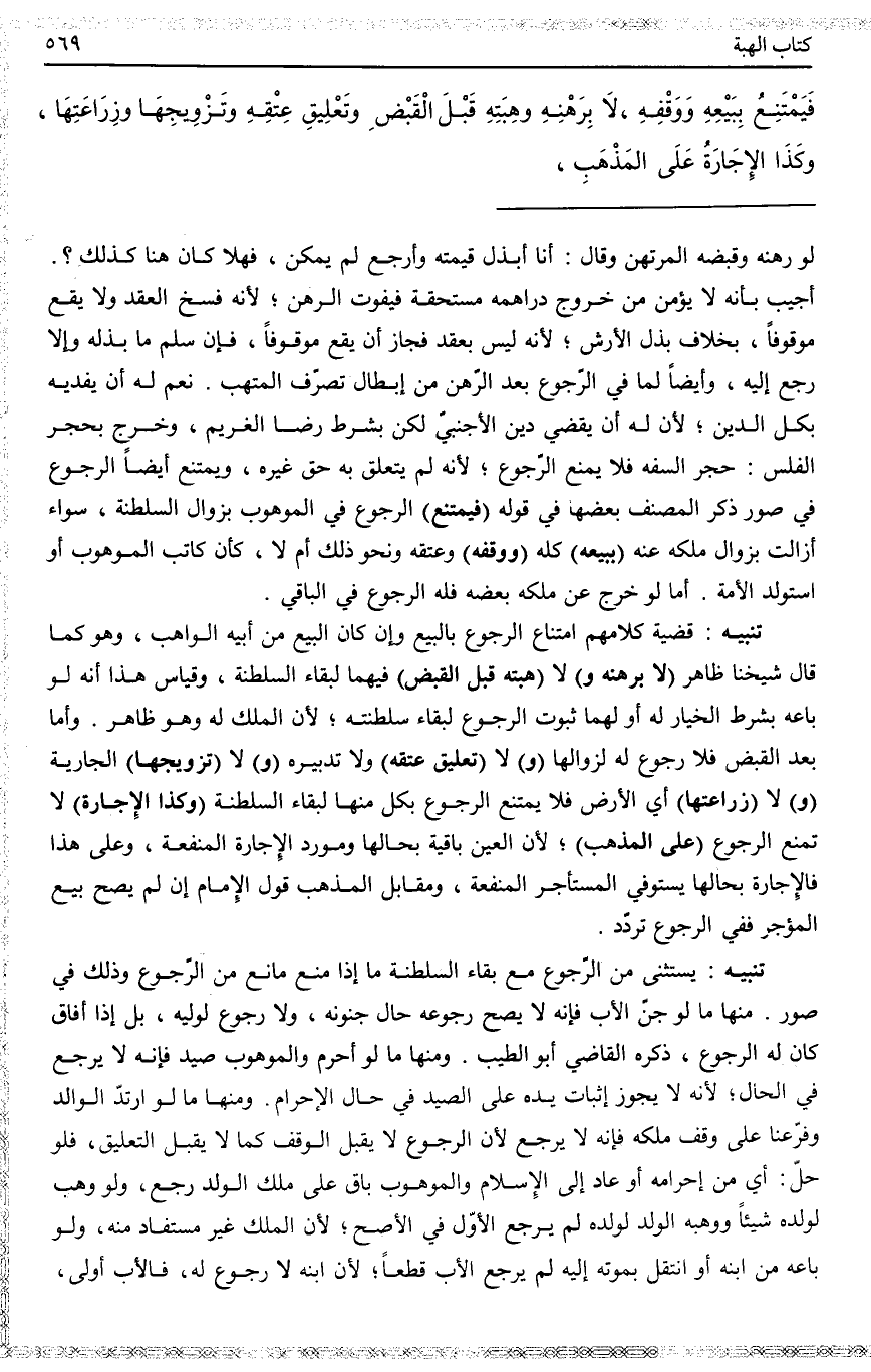 تَنْبِيهٌ يُسْتَثْنَى مِنْ الرُّجُوعِ مَعَ بَقَاءِ السَّلْطَنَةِ مَا إذَا مَنَعَ مَانِعٌ مِنْ الرُّجُوعِ وَذَلِكَ فِي صُوَرٍ. مِنْهَا مَا لَوْ جُنَّ الْأَبُ فَإِنَّهُ لَا يَصِحُّ رُجُوعُهُ حَالَ جُنُونِهِ، وَلَا رُجُوعَ لِوَلِيِّهِ، بَلْ إذَا أَفَاقَ كَانَ لَهُ الرُّجُوعُ، ذَكَرَهُ الْقَاضِي أَبُو الطَّيِّبِ. وَمِنْهَا مَا لَوْ أَحْرَمَ وَالْمَوْهُوبُ صَيْدٌ فَإِنَّهُ لَا يَرْجِعُ فِي الْحَالِّ؛ لِأَنَّهُ لَا يَجُوزُ إثْبَاتُ يَدِهِ عَلَى الصَّيْدِ فِي حَالِ الْإِحْرَامِ. وَمِنْهَا مَا لَوْ ارْتَدَّ الْوَالِدُ وَفَرَّعْنَا عَلَى وَقْفِ مِلْكِهِ فَإِنَّهُ لَا يَرْجِعُ لِأَنَّ الرُّجُوعَ لَا يَقْبَلُ الْوَقْفَ كَمَا لَا يَقْبَلُ التَّعْلِيقَ، فَلَوْ حَلَّ: أَيْ مِنْ إحْرَامِهِ أَوْ عَادَ إلَى الْإِسْلَامِ وَالْمَوْهُوبُ بَاقٍ عَلَى مِلْكِ الْوَلَدِ رَجَعَ، وَلَوْ وَهَبَ لِوَلَدِهِ شَيْئًا وَوَهَبَهُ الْوَلَدُ لِوَلَدِهِ لَمْ يَرْجِعْ الْأَوَّلُ فِي الْأَصَحِّ؛ لِأَنَّ الْمِلْكَ غَيْرُ مُسْتَفَادٍ مِنْهُ، وَلَوْ بَاعَهُ مِنْ ابْنِهِ أَوْ انْتَقَلَ بِمَوْتِهِ إلَيْهِ لَمْ يَرْجِعْ الْأَبُ قَطْعًا؛ لِأَنَّ ابْنَهُ لَا رُجُوعَ لَهُ، فَالْأَبُ أَوْلَى،