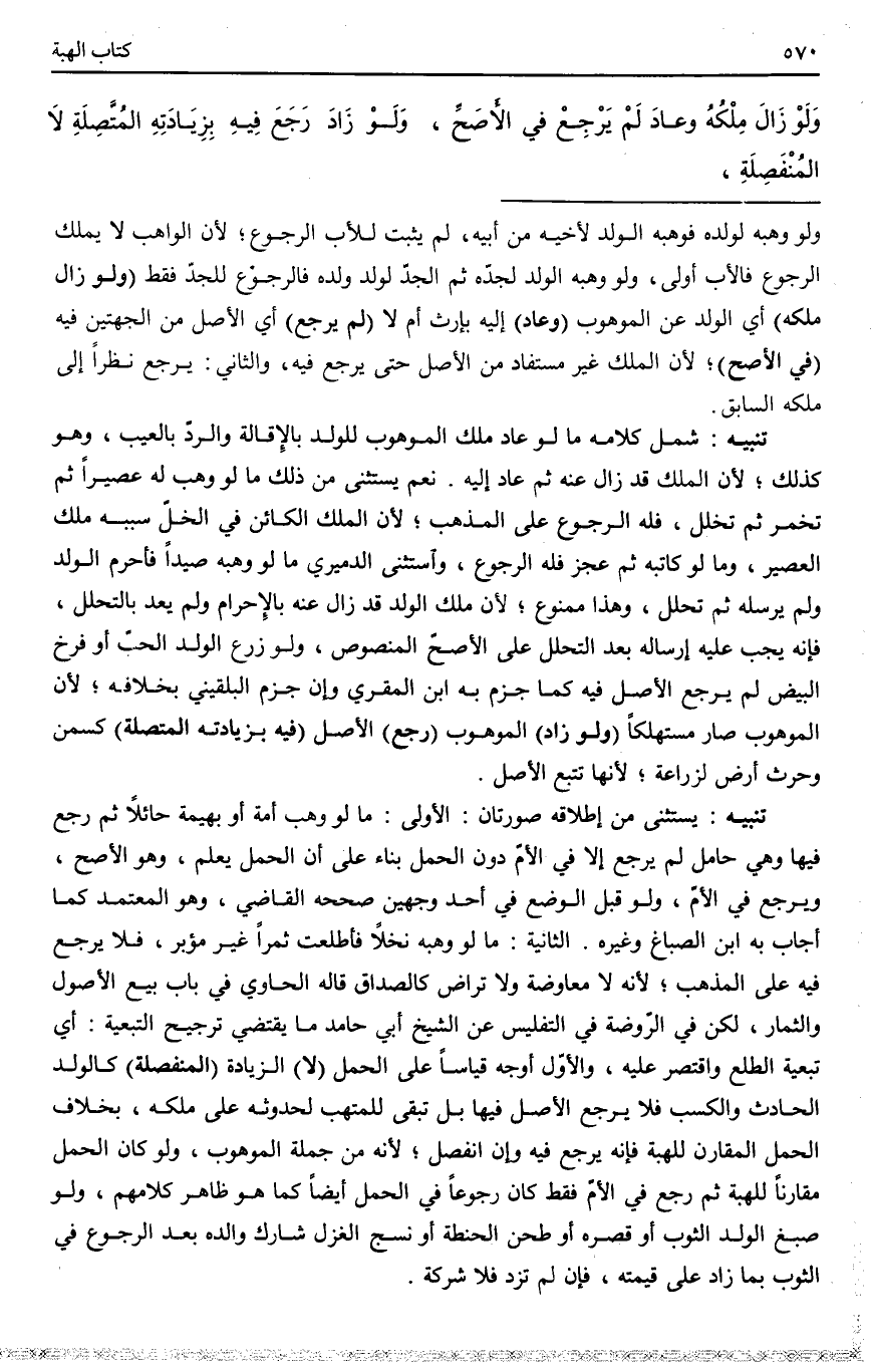 تَنْبِيهٌ يُسْتَثْنَى مِنْ إطْلَاقِهِ صُورَتَانِ: الْأُولَى: مَا لَوْ وَهَبَ أَمَةً أَوْ بَهِيمَةً حَائِلًا ثُمَّ رَجَعَ فِيهَا وَهِيَ حَامِلٌ لَمْ يَرْجِعْ إلَّا فِي الْأُمِّ دُونَ الْحَمْلِ بِنَاءً عَلَى أَنَّ الْحَمْلَ يُعْلَمُ، وَهُوَ الْأَصَحُّ، وَيَرْجِعُ فِي الْأُمِّ، وَلَوْ قَبْلَ الْوَضْعِ فِي أَحَدِ وَجْهَيْنِ صَحَّحَهُ الْقَاضِي، وَهُوَ الْمُعْتَمَدُ كَمَا أَجَابَ بِهِ ابْنُ الصَّبَّاغِ وَغَيْرُهُ.
