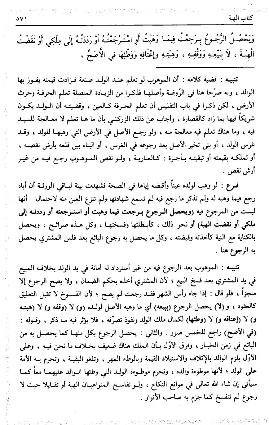 ـــــــــــــــــــــــــــــQتَنْبِيهٌ قَضِيَّةُ كَلَامِهِ: أَنَّ الْمَوْهُوبَ لَوْ تَعَلَّمَ عِنْدَ الْوَلَدِ صَنْعَةً فَزَادَتْ قِيمَتُهُ يَفُوزُ بِهَا الْوَالِدُ، وَبِهِ صَرَّحَا هُنَا فِي الرَّوْضَةِ وَأَصْلِهَا فَذَكَرَا مِنْ الزِّيَادَةِ الْمُتَّصِلَةِ تَعَلُّمَ الْحِرْفَةِ وَحَرْثَ الْأَرْضِ، لَكِنْ ذَكَرَا فِي بَابِ التَّفْلِيسِ أَنَّ تَعَلُّمَ الْحِرْفَةِ كَالْعَيْنِ، وَقَضِيَّتُهُ أَنَّ الْوَلَدَ يَكُونُ شَرِيكًا فِيهَا بِمَا زَادَ كَالْقِصَارَةِ.