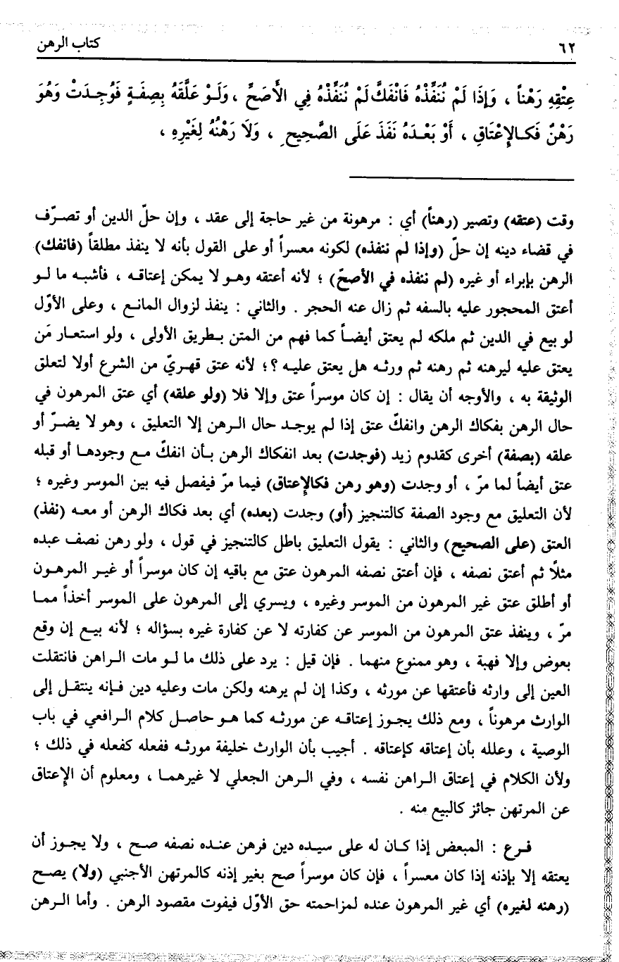 ـــــــــــــــــــــــــــــQوَقْتُ (عِتْقِهِ) وَتَصِيرُ (رَهْنًا) أَيْ: مَرْهُونَةً مِنْ غَيْرِ حَاجَةٍ إلَى عَقْدٍ، وَإِنْ حَلَّ الدَّيْنُ أَوْ تَصَرَّفَ فِي قَضَاءِ دَيْنِهِ إنْ حَلَّ (وَإِذَا لَمْ نُنَفِّذْهُ) لِكَوْنِهِ مُعْسِرًا أَوْ عَلَى الْقَوْلِ بِأَنَّهُ لَا يَنْفُذُ مُطْلَقًا (فَانْفَكَّ) الرَّهْنُ بِإِبْرَاءٍ أَوْ غَيْرِهِ (لَمْ نُنَفِّذْهُ فِي الْأَصَحِّ) ؛ لِأَنَّهُ أَعْتَقَهُ وَهُوَ لَا يُمْكِنُ إعْتَاقُهُ، فَأَشْبَهَ مَا لَوْ أَعْتَقَ الْمَحْجُورَ عَلَيْهِ بِالسَّفَهِ ثُمَّ زَالَ عَنْهُ الْحَجْرُ. وَالثَّانِي: يَنْفُذُ لِزَوَالِ الْمَانِعِ، وَعَلَى الْأَوَّلِ لَوْ بِيعَ فِي الدَّيْنِ ثُمَّ مَلَكَهُ لَمْ يَعْتِقْ أَيْضًا كَمَا فُهِمَ مِنْ الْمَتْنِ بِطَرِيقِ الْأَوْلَى، وَلَوْ اسْتَعَارَ مَنْ يُعْتَقُ عَلَيْهِ لِيَرْهَنَهُ ثُمَّ رَهَنَهُ ثُمَّ وَرِثَهُ هَلْ يُعْتَقُ عَلَيْهِ؛ لِأَنَّهُ عِتْقٌ قَهْرِيٌّ مِنْ الشَّرْعِ أَوْ لَا لِتَعَلُّقِ الْوَثِيقَةِ بِهِ، وَالْأَوْجَهُ أَنْ يُقَالَ: إنْ كَانَ مُوسِرًا عَتَقَ وَإِلَّا فَلَا.