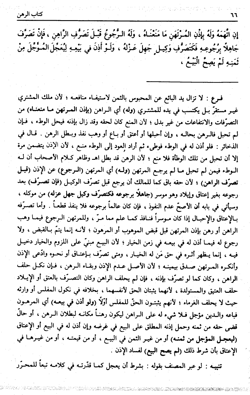 ، (وَلَهُ) أَيْ الْمُرْتَهِنِ (الرُّجُوعُ) عَنْ الْإِذْنِ (قَبْلَ تَصَرُّفِ الرَّاهِنِ) ؛ لِأَنَّ حَقَّهُ بَاقٍ كَمَا لِلْمَالِكِ أَنْ يَرْجِعَ قَبْلَ تَصَرُّفِ الْوَكِيلِ (فَإِنْ تَصَرَّفَ) بَعْدَ رُجُوعِهِ بِغَيْرِ إعْتَاقٍ وَإِيلَادٍ وَهُوَ مُوسِرٌ (جَاهِلًا بِرُجُوعِهِ فَكَتَصَرُّفِ وَكِيلٍ جَهِلَ عَزْلَهُ) مِنْ مُوَكِّلِهِ، وَسَيَأْتِي فِي بَابِهِ أَنَّ الْأَصَحَّ عَدَمُ النُّفُوذِ، فَإِنْ كَانَ عَالِمًا بِرُجُوعِهِ فَلَا يَنْفُذُ قَطْعًا. وَأَمَّا تَصَرُّفُهُ بِالْإِعْتَاقِ وَالْإِحْبَالِ إذَا كَانَ مُوسِرًا فَنَافِذٌ كَمَا عُلِمَ مِمَّا مَرَّ، وَلِلْمُرْتَهِنِ الرُّجُوعُ فِيمَا وَهَبَ الرَّاهِنُ أَوْ رُهِنَ بِإِذْنِ الْمُرْتَهِنِ قَبْلَ قَبْضِ الْمَوْهُوبِ أَوْ الْمَرْهُونِ؛ لِأَنَّهُ إنَّمَا يَتِمُّ بِالْقَبْضِ، وَلَا رُجُوعَ لَهُ فِيمَا أَذِنَ لَهُ فِي بَيْعِهِ فِي زَمَنِ الْخِيَارِ؛ لِأَنَّ الْبَيْعَ مَبْنِيٌّ عَلَى اللُّزُومِ وَالْخِيَارُ دَخِيلٌ فِيهِ، إنَّمَا يَظْهَرُ أَثَرُهُ فِي حَقِّ مَنْ لَهُ الْخِيَارُ، وَمَتَى تَصَرَّفَ بِإِعْتَاقٍ أَوْ نَحْوِهِ وَادَّعَى الْإِذْنَ وَأَنْكَرَهُ الْمُرْتَهِنُ صُدِّقَ بِيَمِينِهِ؛ لِأَنَّ الْأَصْلَ عَدَمُ الْإِذْنَ وَبَقَاءُ الرَّهْنِ، فَإِنْ نَكَلَ حَلَفَ الرَّاهِنُ، وَكَانَ كَمَا لَوْ تَصَرَّفَ بِإِذْنِهِ، فَإِنْ لَمْ يَحْلِفْ الرَّاهِنُ وَكَانَ التَّصَرُّفُ بِالْعِتْقِ أَوْ الْإِيلَادِ حَلَفَ الْعَتِيقُ وَالْمُسْتَوْلَدَة، لِأَنَّهُمَا يُثْبِتَانِ الْحَقَّ لِأَنْفُسِهِمَا، بِخِلَافِهِ فِي نُكُولِ الْمُفْلِسِ أَوْ وَارِثِهِ حَيْثُ لَا يَحْلِفُ الْغُرَمَاءُ؛ لِأَنَّهُمْ يُثْبِتُونَ الْحَقَّ لِلْمُفْلِسِ أَوَّلًا.