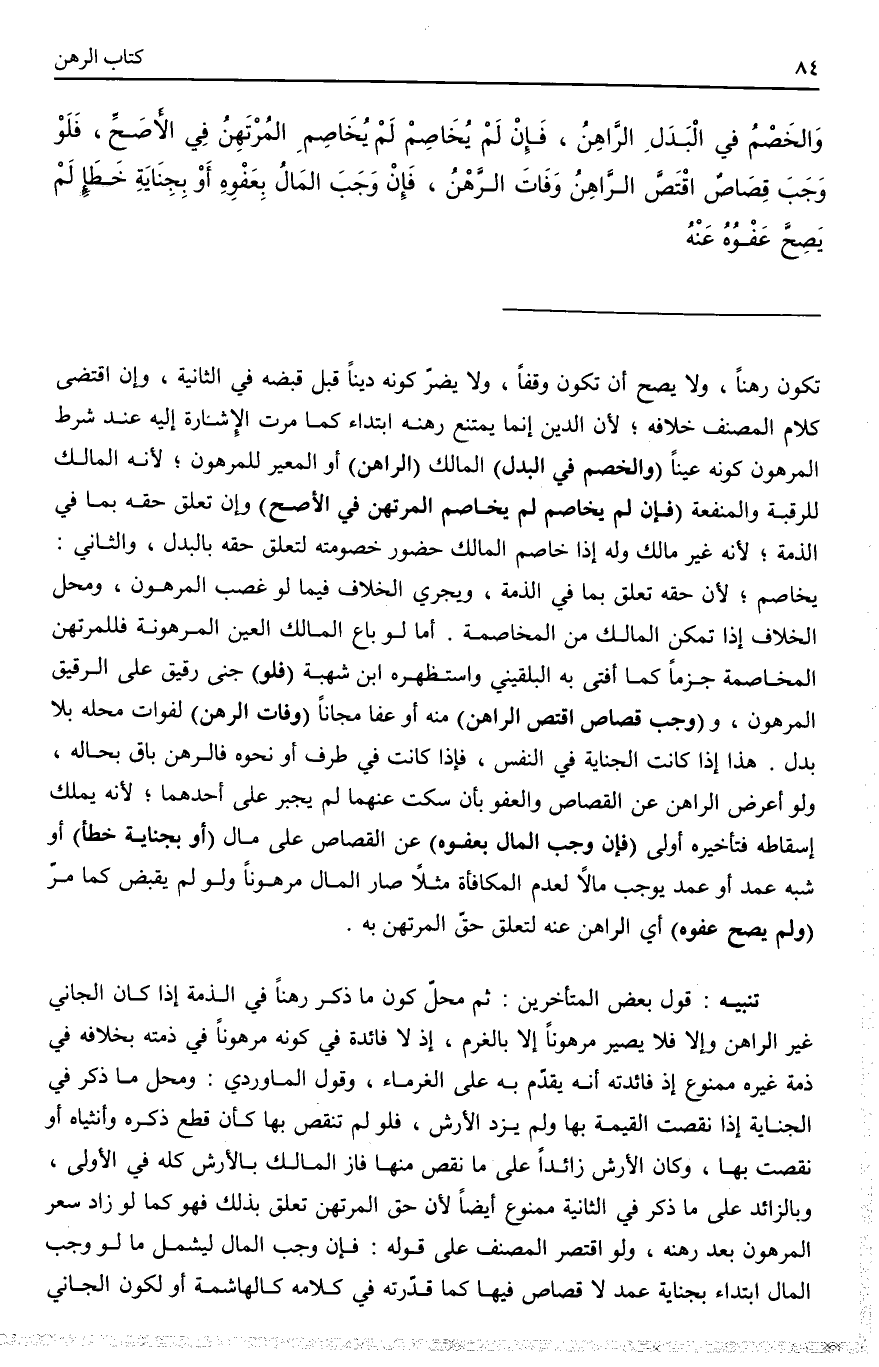 تَنْبِيهٌ: قَوْلُ بَعْضِ الْمُتَأَخِّرِينَ: ثَمَّ مَحَلُّ كَوْنِ مَا ذُكِرَ رَهْنًا فِي الذِّمَّةِ إذَا كَانَ الْجَانِي غَيْرَ الرَّاهِنِ وَإِلَّا فَلَا يَصِيرُ مَرْهُونًا إلَّا بِالْغُرْمِ، إذْ لَا فَائِدَةَ فِي كَوْنِهِ مَرْهُونًا فِي ذِمَّتِهِ بِخِلَافِهِ فِي ذِمَّةِ غَيْرِهِ مَمْنُوعٌ إذْ فَائِدَتُهُ أَنَّهُ يُقَدَّمُ بِهِ عَلَى الْغُرَمَاءِ، وَقَوْلُ الْمَاوَرْدِيُّ: وَمَحَلُّ مَا ذُكِرَ فِي الْجِنَايَةِ إذَا نَقَصَتْ الْقِيمَةُ بِهَا وَلَمْ يَزِدْ الْأَرْشُ فَلَوْ لَمْ تَنْقُصْ بِهَا كَأَنْ قُطِعَ ذَكَرُهُ وَأُنْثَيَاهُ أَوْ نَقَصَتْ بِهَا، وَكَانَ الْأَرْشُ زَائِدًا عَلَى مَا نَقَصَ مِنْهَا فَازَ الْمَالِكُ بِالْأَرْشِ كُلِّهِ فِي الْأُولَى، وَبِالزَّائِدِ عَلَى مَا ذُكِرَ فِي الثَّانِيَةِ مَمْنُوعٌ أَيْضًا لِأَنَّ حَقَّ الْمُرْتَهِنِ تَعَلَّقَ بِذَلِكَ فَهُوَ كَمَا لَوْ زَادَ سِعْرُ الْمَرْهُونِ بَعْدَ رَهْنِهِ، وَلَوْ اقْتَصَرَ الْمُصَنِّفُ عَلَى قَوْلِهِ: فَإِنْ وَجَبَ الْمَالُ لِيَشْمَلَ مَا لَوْ وَجَبَ الْمَالُ ابْتِدَاءً بِجِنَايَةِ عَمْدٍ لَا قِصَاصَ فِيهَا كَمَا قَدَّرْتُهُ فِي كَلَامِهِ كَالْهَاشِمَةِ أَوْ لِكَوْنِ الْجَانِي