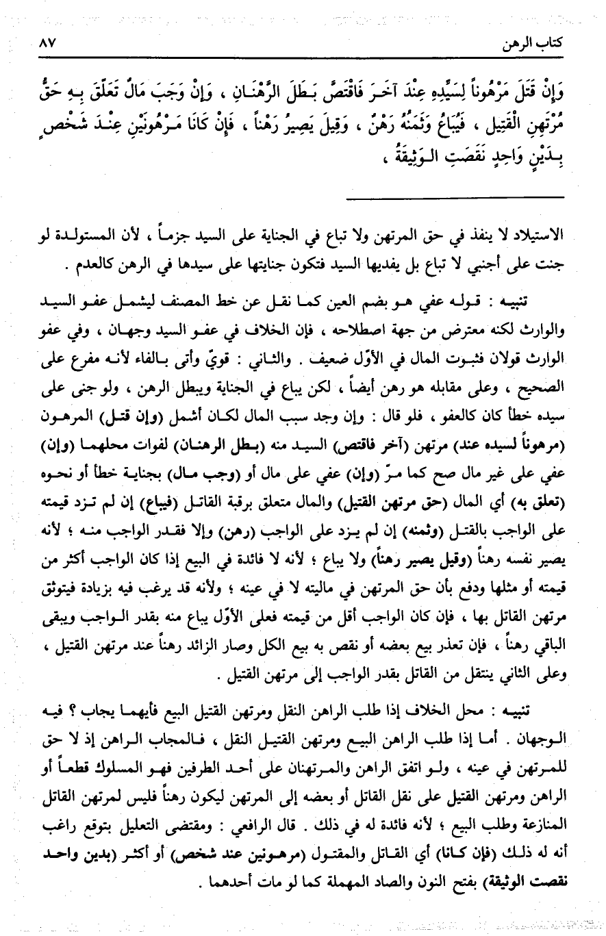 تَنْبِيهٌ: مَحَلُّ الْخِلَافِ إذَا طَلَبَ الرَّاهِنُ النَّقْلَ وَمُرْتَهِنُ الْقَتِيلِ الْبَيْعَ فَأَيُّهُمَا يُجَابُ؟ فِيهِ الْوَجْهَانِ: أَمَّا إذَا طَلَبَ الرَّاهِنُ الْبَيْعَ وَمُرْتَهِنُ الْقَتِيلِ النَّقْلَ، فَالْمُجَابُ الرَّاهِنُ إذْ لَا حَقَّ لِلْمُرْتَهِنِ فِي عَيْنِهِ، وَلَوْ اتَّفَقَ الرَّاهِنُ وَالْمُرْتَهِنَانِ عَلَى أَحَدِ الطَّرَفَيْنِ فَهُوَ الْمَسْلُوكُ قَطْعًا أَوْ الرَّاهِنُ وَمُرْتَهِنُ الْقَتِيلِ عَلَى نَقْلِ الْقَاتِلِ أَوْ بَعْضِهِ إلَى الْمُرْتَهِنِ لِيَكُونَ رَهْنًا فَلَيْسَ لِمُرْتَهِنِ الْقَاتِلِ الْمُنَازَعَةُ وَطَلَبُ الْبَيْعِ؛ لِأَنَّهُ فَائِدَةٌ لَهُ فِي ذَلِكَ. قَالَ الرَّافِعِيُّ: وَمُقْتَضَى التَّعْلِيلِ بِتَوَقُّعِ رَاغِبٍ أَنَّهُ لَهُ ذَلِكَ.