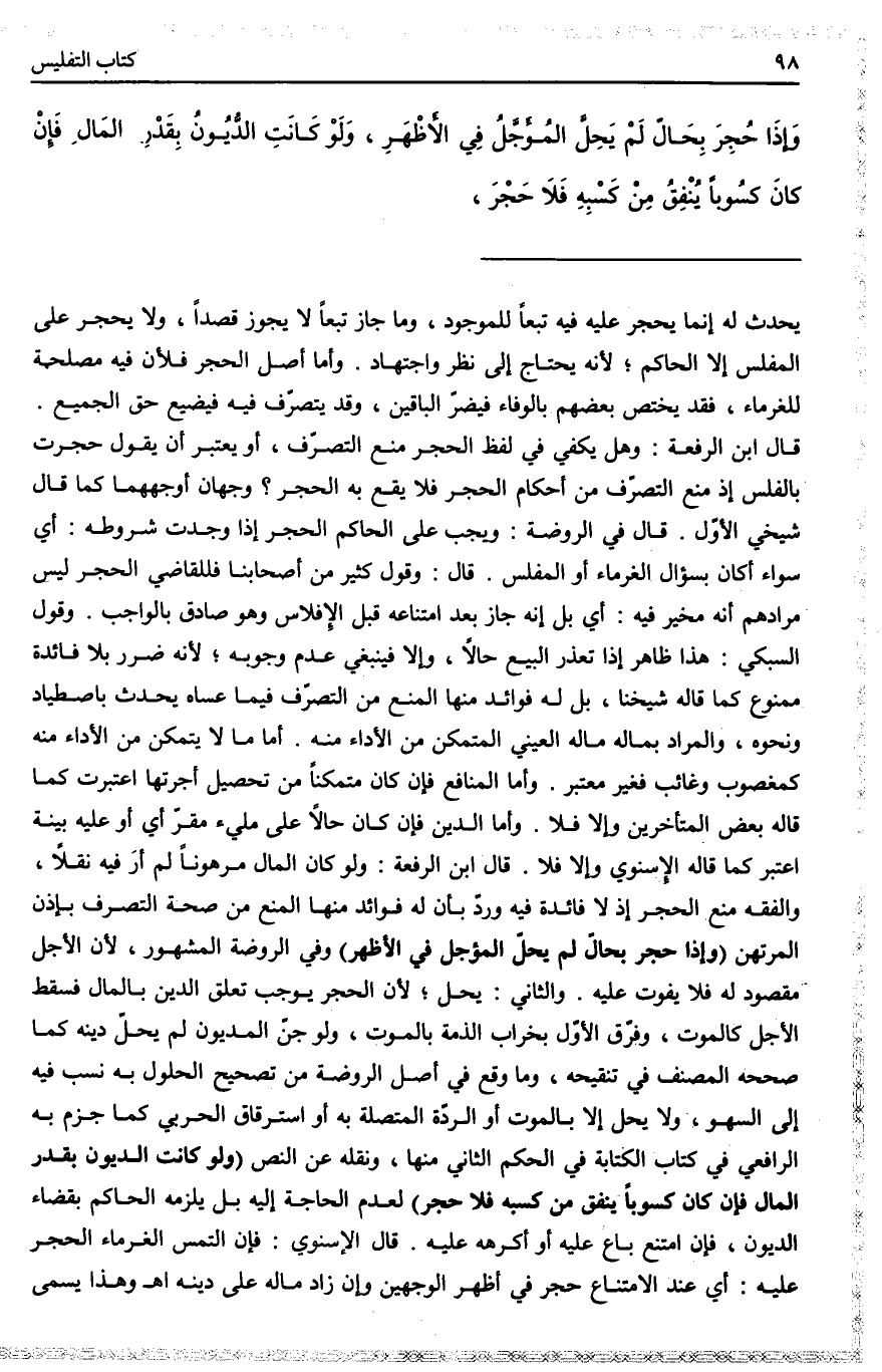 وَأَمَّا أَصْلُ الْحَجْرِ فَلِأَنَّ فِيهِ مَصْلَحَةً لِلْغُرَمَاءِ، فَقَدْ يَخْتَصُّ بَعْضُهُمْ بِالْوَفَاءِ فَيَضُرُّ الْبَاقِينَ، وَقَدْ يَتَصَرَّفُ فِيهِ فَيُضَيِّعُ حَقَّ الْجَمِيعِ. قَالَ ابْنُ الرِّفْعَةِ: وَهَلْ يَكْفِي فِي لَفْظِ الْحَجْرِ مَنْعُ التَّصَرُّفِ، أَوْ يُعْتَبَرُ أَنْ يَقُولَ حَجَرْت بِالْفَلِسِ إذْ مَنْعُ التَّصَرُّفِ مِنْ أَحْكَامِ الْحَجْرِ فَلَا يَقَعُ بِهِ الْحَجْرُ؟ وَجْهَانِ أَوْجَهُهُمَا كَمَا قَالَ شَيْخِي الْأَوَّلُ.