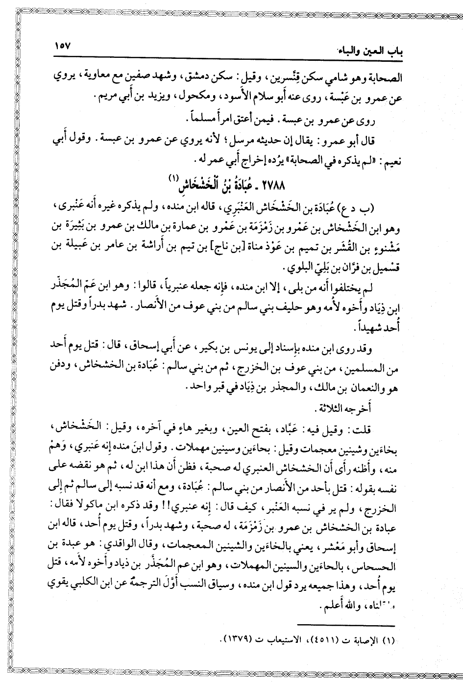 قلت: وقيل فيه: عباد، بفتح العين، وبغير هاء في آخره، وقيل: الخشخاش، بخاءين وشينين معجمات، وقيل: بحاءين وسينين مهملات، وقول ابن منده إنه عنبري، وهم منه، وأظنه رَأَى أن الخشخاش العنبري له صحبة، فظن أن هذا ابن له، ثم هو نقضه عَلَى نفسه بقوله: قتل بأحد من الأنصار من بني سالم: عبادة، ومع أَنَّهُ قد نسبه سالم ثم إِلَى الخزرج، ولم ير في نسبه العنبر، كيف قال: إنه عنبري!! وقد ذكره ابن ماكولا فقال: عبادة بْن الخشخاش بْن عمرو بْن زمزمة، له صحبة، وشهد بدرًا، وقتل يَوْم أحد، قاله ابن إِسْحَاق، وَأَبُو معشر، يعني بالخاءين والشينين المعجمات، وقال الواقدي: هو عبدة بْن الحسحاس، بالحاءين والسينين المهملات، وهو ابن عم المجذر بْن زياد، وأخوه لأمه، قتل يَوْم أحد، وهذا جميعه يرد قول ابن منده، وسياق النسب أول الترجمة عن ابن الكلبي يقوي ما قلناه، والله أعلم.