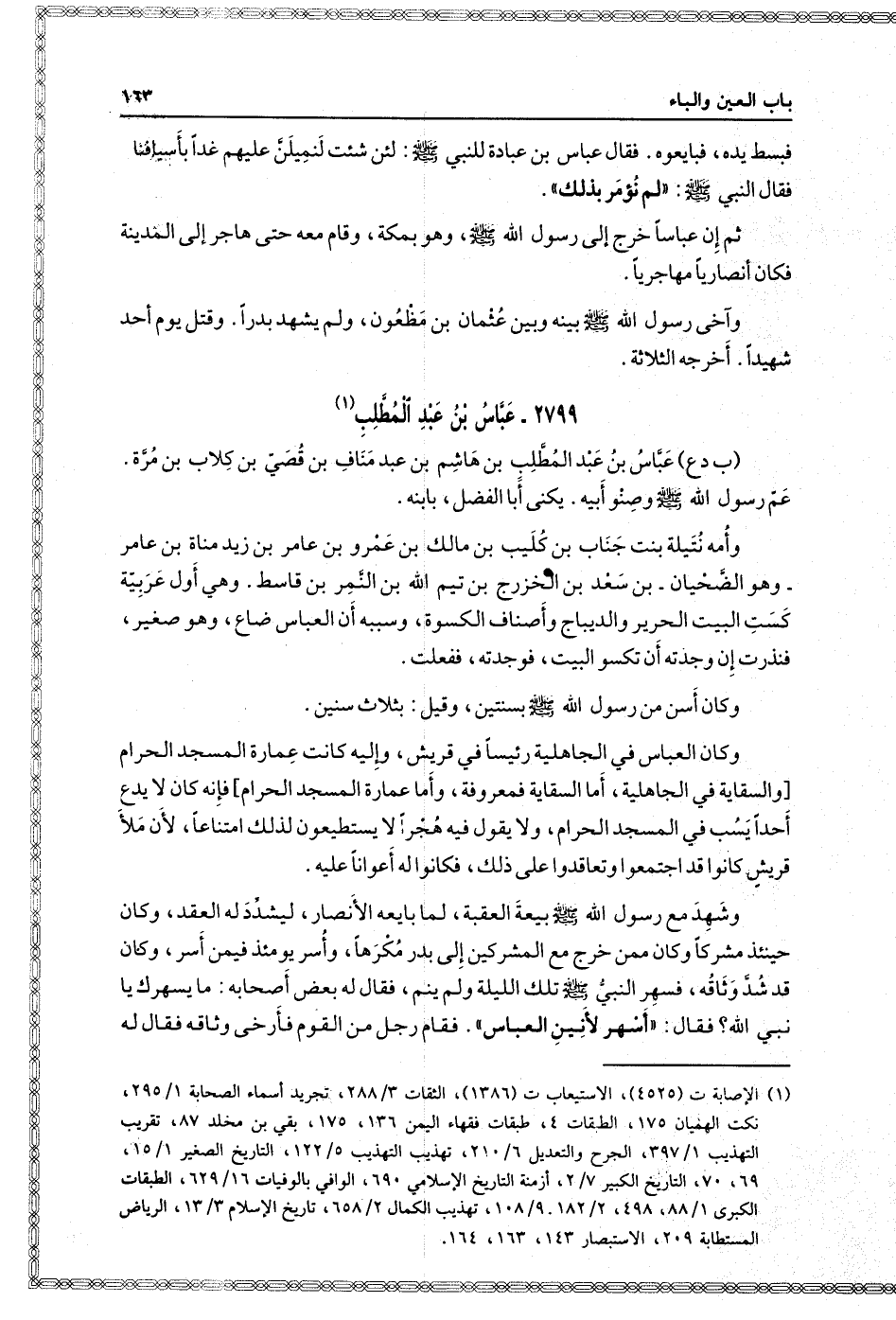 وشهد مع رسول صَلَّى اللَّهُ عَلَيْهِ وَسَلَّمَ بيعة العقبة، لما بايعه الأنصار، ليشدد له العقد، وكان حينئذ مشركًا وكان ممن خرج مع المشركين إِلَى بدر مكرها، وأسر يومئذ فيمن أسر، وكان قد شد وثاقه، فسهر النَّبِيّ صَلَّى اللَّهُ عَلَيْهِ وَسَلَّمَ تلك الليلة ولم ينم، فقال له بعض أصحابه: ما يسهرك يا نبي اللَّه؟ فقال: " أسهر لأنين العباس "، فقام رجل من القوم فأرخى وثاقه، فقال له رَسُول اللَّهِ صَلَّى اللَّهُ عَلَيْهِ وَسَلَّمَ: " مالي لا أسمع أنين العباس؟ "، فقال الرجل: أنا أرخيت من وثاقه فقال رَسُول اللَّهِ صَلَّى اللَّهُ عَلَيْهِ وَسَلَّمَ: " فافعل ذلك بالأسرى كلهم "، وفدى يَوْم بدر نفسه وابني أخويه: عقيل بْن أَبِي طالب، ونوفل بْن الحارث، وأسلم عقيب ذلك وقيل: إنه أسلم قبل الهجرة، وكان يكتم إسلامه، كان بمكة يكتب إِلَى رَسُول اللَّهِ صَلَّى اللَّهُ عَلَيْهِ وَسَلَّمَ أخبار المشركين، وكان من بمكة من المسلمين يتقوون به، وكان لهم عونا عَلَى إسلامهم، وأراد الهجرة إِلَى رَسُول اللَّهِ صَلَّى اللَّهُ عَلَيْهِ وَسَلَّمَ فقال له رَسُول اللَّهِ صَلَّى اللَّهُ عَلَيْهِ وَسَلَّمَ: " مقامك بمكة خير "، فلذلك قال رَسُول اللَّهِ صَلَّى اللَّهُ عَلَيْهِ وَسَلَّمَ يَوْم بدر: " من لقي العباس فلا يقتله، فإنه أخرج كرهًا "، وقصة الحجاج بْن علاط تشهد بذلك، وقال له النَّبِيّ صَلَّى اللَّهُ عَلَيْهِ وَسَلَّمَ: " أنت آخر المهاجرين كما أنني آخر الأنبياء ".
