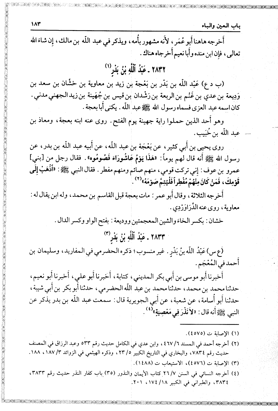 ب د ع: عَبْد اللَّهِ بْن بدر بْن بعجة بْن زيد بن معاوية بْن خشان بْن سعد بْن وديعة بْن عدي بْن غنم بْن الربعة بْن رشدان بْن قيس بْن جهينة بْن زيد الجهني مدني، وكان اسمه عبد العزى فسماه رَسُول اللَّهِ صَلَّى اللَّهُ عَلَيْهِ وَسَلَّمَ عَبْد اللَّهِ، يكنى أبا بعجة.
