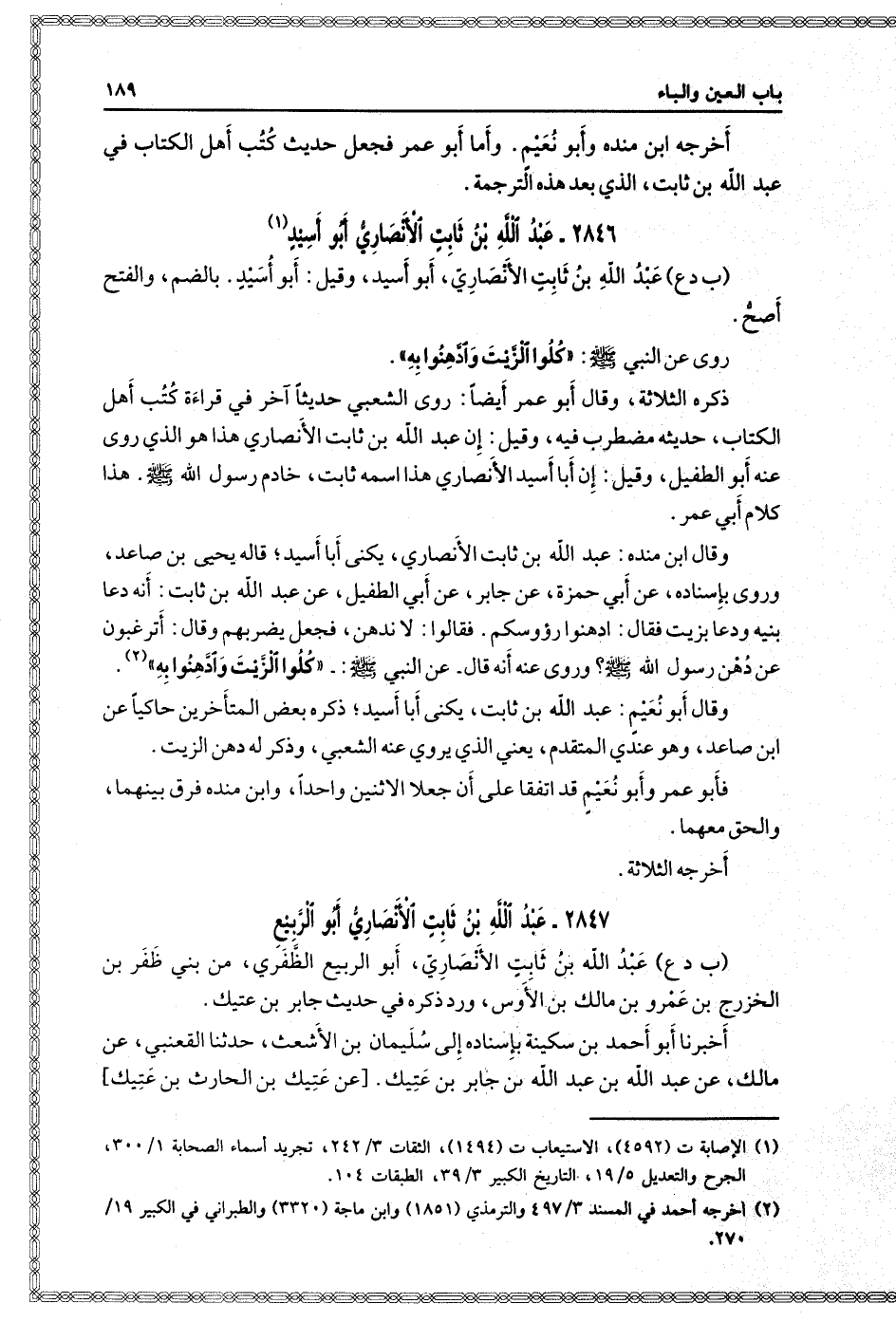 وقال ابن منده: عَبْد اللَّهِ بْن ثابت الأنصاري، يكنى أبا أسيد، قاله يحيى بْن صاعد، وروى بِإِسْنَادِهِ، عن أَبِي حمزة، عن جابر، عن أَبِي الطفيل، عن عَبْد اللَّهِ بْن ثابت، أَنَّهُ دعا بنيه ودعا بزيت، فقال: ادهنوا رءوسكم، فقالوا: لا ندهن، فجعل يضربهم، وقال: أترغبون عن دهن رَسُول اللَّهِ صَلَّى اللَّهُ عَلَيْهِ وَسَلَّمَ وروى عنه أَنَّهُ قال، عن النَّبِيّ صَلَّى اللَّهُ عَلَيْهِ وَسَلَّمَ: " كلوا الزيت وادهنوا به ".