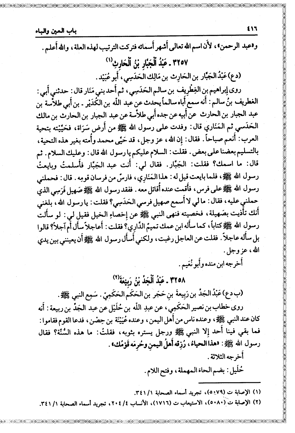 د ع: عَبْد الجبار بْن الحارث بْن مَالِك الحدسي أَبُو عُبَيْد رَوَى إِبْرَاهِيمُ بْنُ الْغِطْرِيفِ بْنِ سَالِمٍ الْحَدَسِيُّ، ثُمَّ أَحَدُ بَنِي مَنَارَةَ، قَالَ: حَدَّثَنِي أَبِي: الْغِطْرِيفُ بْنُ سَالِمٍ، أَنَّهُ سَمِعَ أَبَاهُ سَالِمًا يُحَدِّثُ، عَنْ عَبْدِ اللَّهِ بْنِ الْكُدَيْرِ بْنِ أَبِي طلاسَةَ بْنِ عَبْدِ الْجَبَّارِ بْنِ الْحَارِثِ، عَنْ أَبِيهِ، عَنْ جَدِّهِ أَبِي طلاسَةَ، عَنْ عَبْدِ الْجَبَّارِ بْنِ الْحَارِثِ بْنِ مَالِكٍ الْحَدَسِيِّ ثُمَّ الْمَنَارِيِّ، قَالَ: وَفَدْتُ عَلَى رَسُولِ اللَّهِ صَلَّى اللَّهُ عَلَيْهِ وَسَلَّمَ مِنْ أَرْضِ سَرَاةَ، فَحَيَّيْتُهُ بِتَحِيَّةِ الْعَرَبِ: أَنْعِمْ صَبَاحًا، فَقَالَ: " إِنَّ اللَّهَ عَزَّ وَجَلَّ قَدْ حَيَّا مُحَمَّدًا وَأُمَّتَهُ بِغَيْرِ هَذِهِ التَّحِيَّةِ، بِالتَّسْلِيمِ بَعْضُنَا عَلَى بَعْضٍ "، فَقُلْتُ: السَّلامُ عَلَيْكُمْ يَا رَسُولَ اللَّهِ، قَالَ: " وَعَلَيْكَ السَّلامُ "، ثُمَّ قَالَ: " مَا اسْمُكَ؟ "، فَقُلْتُ: الْجَبَّارُ، فَقَالَ لِي: " أَنْتَ عَبْدُ الْجَبَّارِ "، فَأَسْلَمْتُ وَبَايَعْتُ رَسُولَ اللَّهِ صَلَّى اللَّهُ عَلَيْهِ وَسَلَّمَ فَلَمَّا بَايَعْتُ، قِيلَ لَهُ: هَذَا الْمَنَارِيُّ، فَارِسٌ مِنْ فُرْسَانِ قَوْمِهِ، قَالَ: فَحَمَلَنِي رَسُولُ اللَّهِ صَلَّى اللَّهُ عَلَيْهِ وَسَلَّمَ عَلَى فَرَسٍ، فَأَقَمْتُ عِنْدَهُ أُقَاتِلُ مَعَهُ، فَفَقَدَ رَسُولُ اللَّهِ صَلَّى اللَّهُ عَلَيْهِ وَسَلَّمَ صَهِيلَ فَرَسِي الَّذِي حَمَلَنِي عَلَيْهِ، فَقَالَ: " مَا لِي لا أَسْمَعُ صَهِيلَ فَرَسِ الْحَدَسِيِّ؟ "، فَقُلْتُ: يَا رَسُولَ اللَّهِ، بَلَغَنِي أَنَّكَ تَأَذَّيْتَ بِصَهِيلِهِ، فَخَصَيْتُهُ، فَنَهَى النَّبِيُّ صَلَّى اللَّهُ عَلَيْهِ وَسَلَّمَ عَنْ إِخْصَاءِ الْخَيْلِ، فَقِيلَ لِي: لَوْ سَأَلْتَ رَسُولَ اللَّهِ صَلَّى اللَّهُ عَلَيْهِ وَسَلَّمَ كِتَابًا، كَمَا سَأَلْتَ ابْنَ عَمِّكَ تَمِيمًا الدَّارِيَّ؟ فَقُلْتُ: أَعَاجِلا أَسْأَلُ أَمْ آجِلا؟ قَالُوا: بَلْ مَسْأَلَةٌ عَاجِلَةٌ، فَقُلْتُ: عَنِ الْعَاجِلِ رَغِبْتُ، وَلَكِنِّي أَسْأَلُ رَسُولَ اللَّهِ صَلَّى اللَّهُ عَلَيْهِ وَسَلَّمَ أَنْ يُعِينَنِي بَيْنَ يَدَيِ اللَّهِ عَزَّ وَجَلَّ ابْنُ مَنْدَهْ وَأَبُو نُعَيْمٍ.