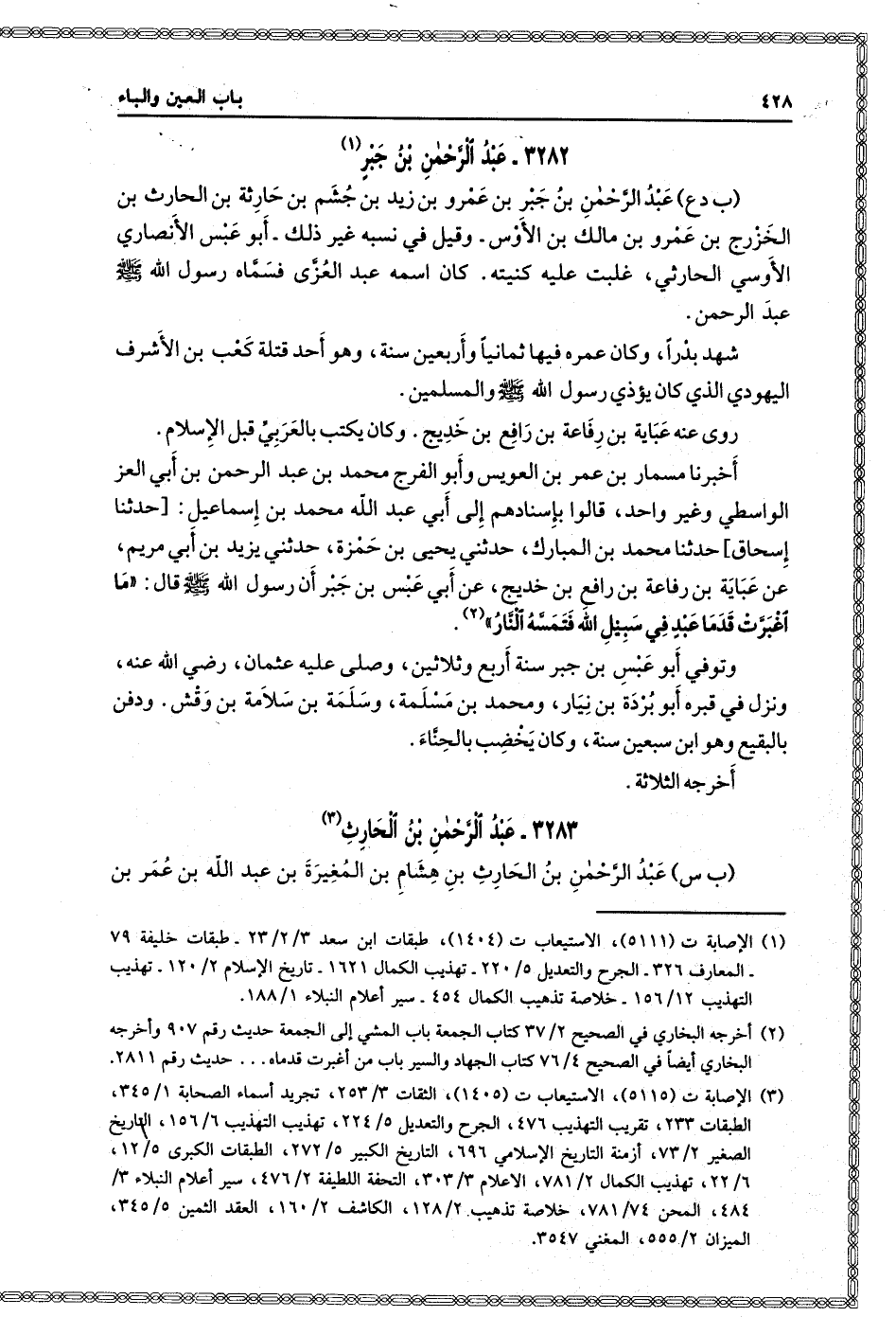 ب د ع: عَبْد الرَّحْمَن بْن جبر بْن عَمْرو بْن زَيْد بْن جشم بْن حارثة بْن الحارث بْن الخزرج بْن عَمْرو بْن مَالِك بْن الأوس وقيل فِي نسبه غير ذَلِكَ، أَبُو عبس الْأَنْصَارِيّ الأوسي الحارثي، غلبت عَلَيْهِ كنيته، كَانَ اسمه عَبْد العزي فسماه رَسُول اللَّه صَلَّى اللَّهُ عَلَيْهِ وَسَلَّمَ عَبْد الرَّحْمَن، شهد بدرًا، وكان عمره فيها ثمانيًا وأربعين سنة، وهو أحد قتلة كعب بْن الأشرف اليهودي الَّذِي كَانَ يؤذي رَسُول اللَّه صَلَّى اللَّهُ عَلَيْهِ وَسَلَّمَ والمسلمين.