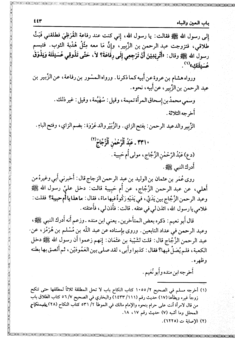 عَبْد الرَّحْمَن الزجاج مَوْلَى أم حبيبة، أدرك النَّبِيّ صَلَّى اللَّهُ عَلَيْهِ وَسَلَّمَ رَوَى عُمَرُ بْنُ عُثْمَانَ بْنِ الْوَلِيدِ بْنِ عَبْدِ الرَّحْمَنِ الزَّجَّاجُ، قَالَ: أَخْبَرَنِي أَبِي، وَغَيْرُهُ مِنْ أَهْلِي، عَنْ عَبْدِ الرَّحْمَنِ الزَّجَّاجِ، عَنْ أُمِّ حَبِيبَةَ، قَالَتْ: دَخَلَ عَلَيَّ رَسُولُ اللَّهِ صَلَّى اللَّهُ عَلَيْهِ وَسَلَّمَ وَعَبْدُ الرَّحْمَنِ الزَّجَّاجُ بَيْنَ يَدِي، وَفِي يَدَيْهِ رَكْوَةٌ فِيهَا مَاءٌ، فَقَالَ: " مَا هَذَا يَا أُمَّ حَبِيبَةَ؟ "، فَقُلْتُ: غُلامِي يَا رَسُولَ اللَّهِ، ائْذَنْ لِي فِي عِتْقِهِ، قَالَتْ: فَأَذِنَ لِي، فَأَعْتَقَتْهُ.