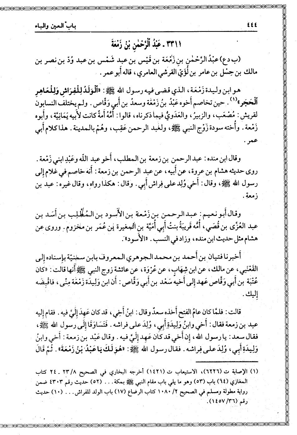 (٩١٦) أَخْبَرَنَا فِتْيَانُ بْنُ أَحْمَدَ بْنِ مُحَمَّدٍ الْجَوْهَرِيُّ الْمَعْرُوفُ بِابْنِ سُمَيْنَةَ، بِإِسْنَادِهِ إِلَى الْقَعْنَبِيِّ، عَنْ مَالِكٍ، عَنِ ابْنِ شِهَابٍ، عَنْ عُرْوَةَ، عَنْ عَائِشَةَ زَوْجِ النَّبِيِّ صَلَّى اللَّهُ عَلَيْهِ وَسَلَّمَ أَنَّهَا قَالَتْ: كَانَ عُتْبَةُ بْنُ أَبِي وَقَّاصٍ عَهِدَ إِلَى أَخِيهِ سَعْدِ بْنِ أَبِي وَقَّاصٍ: أَنَّ ابْنَ وَلِيدَةِ زَمْعَةَ مِنِّي، فَاقْبِضْهُ إِلَيْكَ، قَالَتْ: فَلَمَّا كَانَ عَامُ الْفَتْحِ أَخَذَهُ سَعْدٌ، وَقَالَ: ابْنُ أَخِي، قَدْ كَانَ عَهِدَ إِلَيَّ فِيهِ، فَقَامَ إِلَيْه عَبْدُ بْنُ زَمْعَةَ، فَقَالَ: أَخِي، وَابْنُ وَلِيدَةِ أَبِي، وُلِدَ عَلَى فِرَاشِهِ، فَتَسَاوَقَا إِلَى رَسُولِ اللَّهِ صَلَّى اللَّهُ عَلَيْهِ وَسَلَّمَ فَقَالَ سَعْدٌ: يَا رَسُولَ اللَّهِ، إِنَّ أَخِي قَدْ كَانَ عَهِدَ إِلَيَّ فِيهِ، وَقَالَ عَبْدُ بْنُ زَمْعَةَ: أَخِي وَابْنُ وَلِيدَةِ أَبِي، وُلِدَ عَلَى فِرَاشِهِ، فَقَالَ رَسُولُ اللَّهِ صَلَّى اللَّهُ عَلَيْهِ وَسَلَّمَ: " هُوَ لَكَ يَا عَبْدَ بْنَ زَمْعَةَ "، ثُمَّ قَالَ رَسُولُ اللَّهِ صَلَّى اللَّهُ عَلَيْهِ وَسَلَّمَ: " الْوَلَدُ لِلْفِرَاشِ وَلِلْعَاهِرِ الْحَجَرُ "، ثُمَّ قَالَ لِسَوْدَةَ بِنْتِ زَمْعَةَ: " احْتَجِبِي مِنْهُ "، لِمَا رَأَى مِنْ شَبَهِهِ بِعُتْبَةَ بْنِ أَبِي وَقَّاصٍ، قَالَتْ: فَمَا رَآهَا حَتَّى لَقِيَ اللَّهَ عَزَّ وَجَلَّ: أَخْرَجَهُ الثَّلاثَةُ واختلفوا فِي نسبه اختلافًا كبيرًا، لا يمكن الجمع بين أقوالهم، والصحيح هُوَ الَّذِي قاله أَبُو عُمَر، ودليله أن أبا نعيم ذكر فِي عَبْد بْن زمعة بْن الأسود، أَنَّهُ أخو سودة بِنْت زمعة، وذكر ابْنُ منده فِي عَبْد بْن زمعة أيضًا، أَنَّهُ أخو سودة، وذكرا فِي نسب سودة أنها بِنْت زمعة بْن قيس كما سقناه أولًا، فبان بهذا أن عَبْد الرَّحْمَن الَّذِي قالا: إنه أخو عَبْد بْن زمعة هُوَ ابْنُ زمعة بْن قيس العامري، لا زمعة بْن الأسود الأسدي، ومما يؤيد هَذَا القول، أن النَّبِيّ صَلَّى اللَّهُ عَلَيْهِ وَسَلَّمَ لما اختصم سعد، وعبد بْن زمعة فِي ولد وليدة زمعة رَأَى رَسُول اللَّه صَلَّى اللَّهُ عَلَيْهِ وَسَلَّمَ شبهًا بينًا بعتبة بْن أَبِي وقاص، فَقَالَ لسودة بِنْت زمعة زوجته: " احتجبي مِنْهُ "، " والولد للفراش "، فلو لم يكن أخاها لأنَّه ولد عَلَى فراش أبيها، لما أمرها بالاحتجاب مِنْهُ، لما رَأَى فِيهِ من شبهة عتبة، والله أعلم.