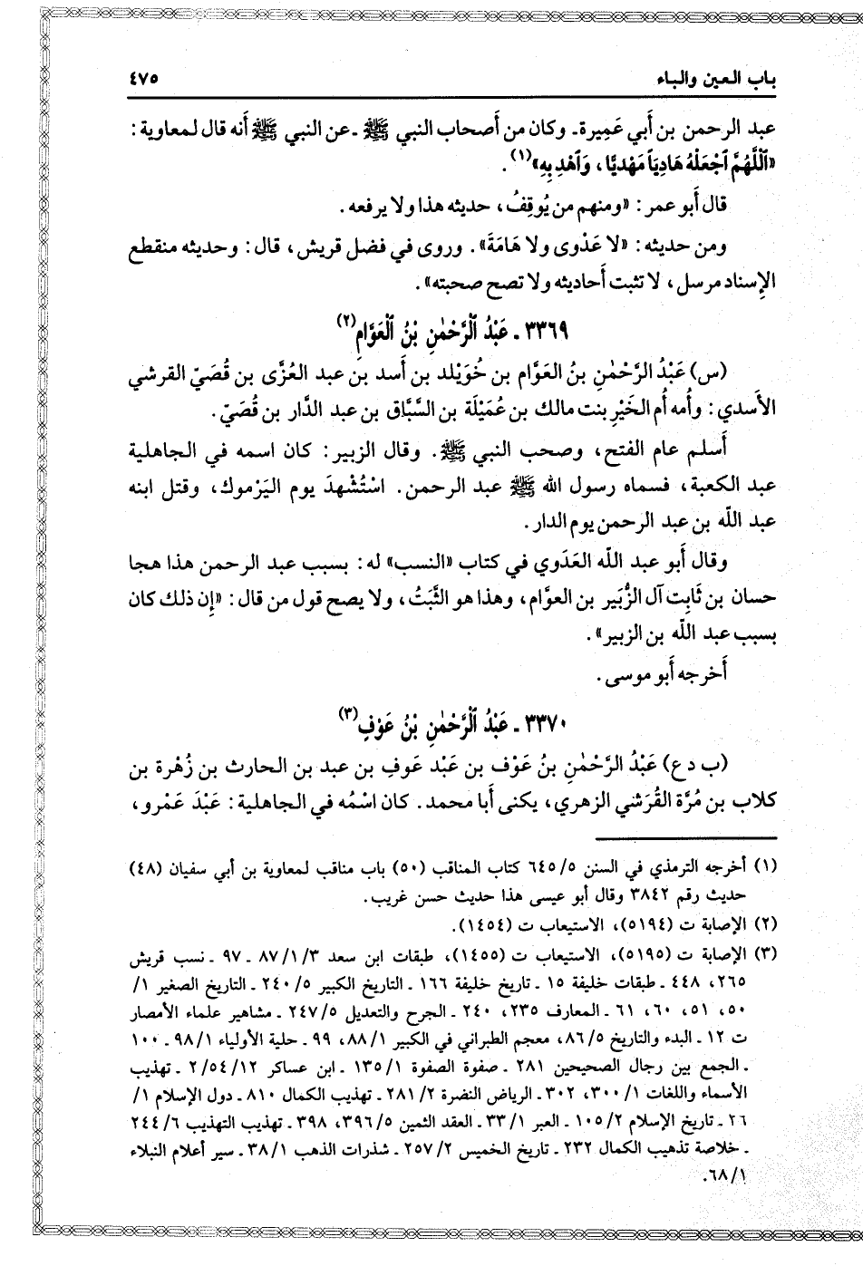 ب د ع عَبْد الرَّحْمَن بْن عوف بْن عَبْد عوف بْن عَبْد بْن الحارث بْن زهرة بْن كلاب بْن مرة الْقُرَشِيّ الزُّهْرِيّ يكنى أبا مُحَمَّد كَانَ اسمه فِي الجاهلية عَبْد عَمْرو وقيل عَبْد الكعبة فسماه رَسُول اللَّه صَلَّى اللَّهُ عَلَيْهِ وَسَلَّمَ عَبْد الرَّحْمَن وأمه الشفا بِنْت عوف بْن عَبْد بْن الحارث بْن زهرة ولد بعد الفيل بعشر سنين، وأسلم قبل أن يدخل الرَّسُول صَلَّى اللَّهُ عَلَيْهِ وَسَلَّمَ دار الأرقم وكان أحد الثمانية الَّذِيِْنَ سبقوا إلى الْإِسْلَام، وأحد الخمسة الَّذِيِْنَ أسلموا عَلَى يد أَبِي بَكْر، وَقَدْ ذكرناهم فِي ترجمة أَبِي بَكْر، وكان من المهاجرين الأولين، هاجر إلى الحبشة، وإلى المدينة، وآخى رَسُول اللَّه صَلَّى اللَّهُ عَلَيْهِ وَسَلَّمَ بينه، وبين سعد بْن الربيع.