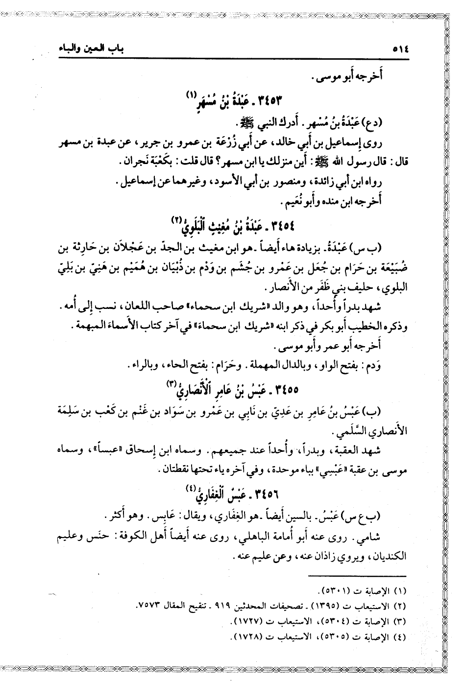 ب: عبس بْن عَامِر بْن عدي بْن نابي بْن عَمْرو بْن سواد بْن غنم بْن كعب بْن سلمة الْأَنْصَارِيّ السلمي شهد العقبة، وبدرًا، وأحدًا عند جميعهم، وسماه ابْنُ إِسْحَاق عبسًا، وسماه مُوسَى بْن عقبة عبسى بباء موحدة، وفي آخره ياء تحتها نقطتان.