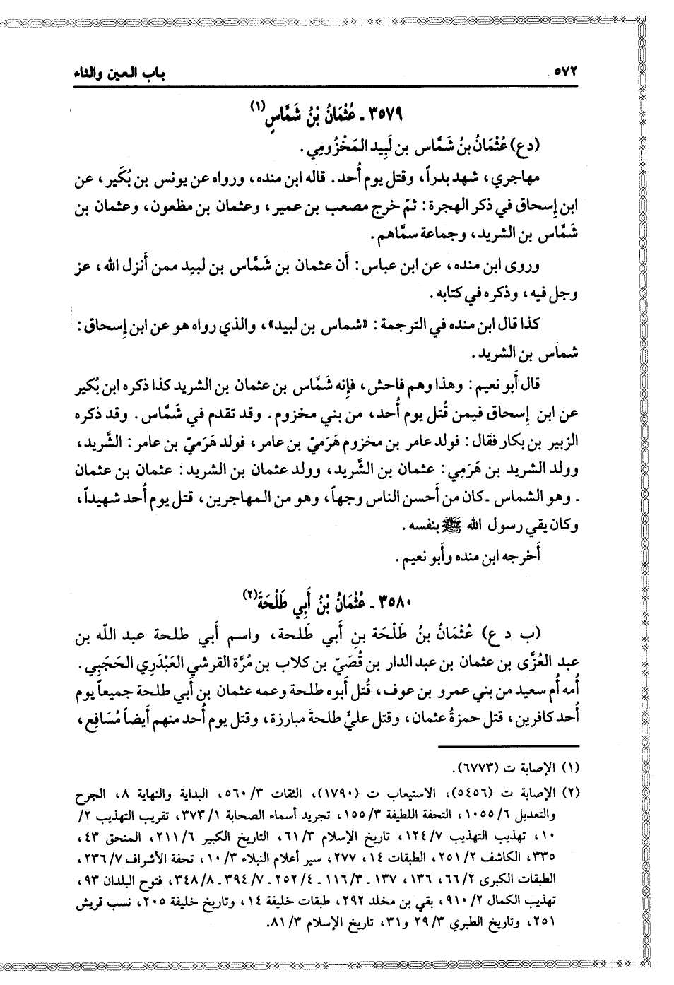ب د ع: عثمان بْن طلحة بْن أَبِي طلحة واسم أَبِي طلحة عَبْد اللَّه بْن عَبْد العزى بْن عثمان بْن عَبْد الدار بْن قصي بْن كلاب بْن مرة الْقُرَشِيّ العبدري الحجبي، أمه أم سَعِيد من بني عَمْرو بْن عوف، قتل أَبُوهُ طلحة، وعمه عثمان بْن أَبِي طلحة جميعًا يَوْم أحد كافرين، قتل حمزة عثمان، وقتل عليّ طلحة مبارزة، وقتل يَوْم أحد منهم أيضا مسافع، والجلاس، والحارث، وكلاب بنو طلحة، كلهم إخوة عثمان بْن طلحة، قتلوا كفارًا، قتل عاصم بْن ثابت بْن أَبِي الأقلح: مسافعًا، والجلاس، وقتل الزُّبَيْر، كلابًا، وقتل قزمان: الحارث.
