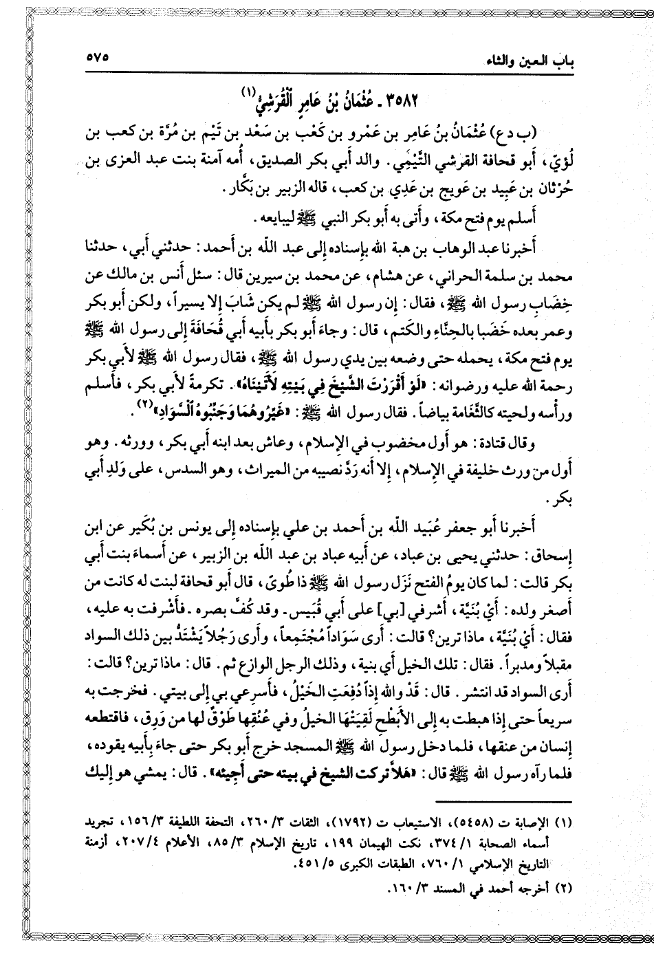 ب د ع: عثمان بْن عَامِر بْن عَمْرو بْن كعب بْن سعد بْن تيم بْن مرة بْن كعب بْن لؤي أَبُو قحافة الْقُرَشِيّ التيمي والد أَبِي بَكْر الصديق، أمه آمنه بِنْت عَبْد العزى بْن حرثان بْن عُبَيْد بْن عويج بْن عدي بْن كعب، قاله الزُّبَيْر بْن بكار.