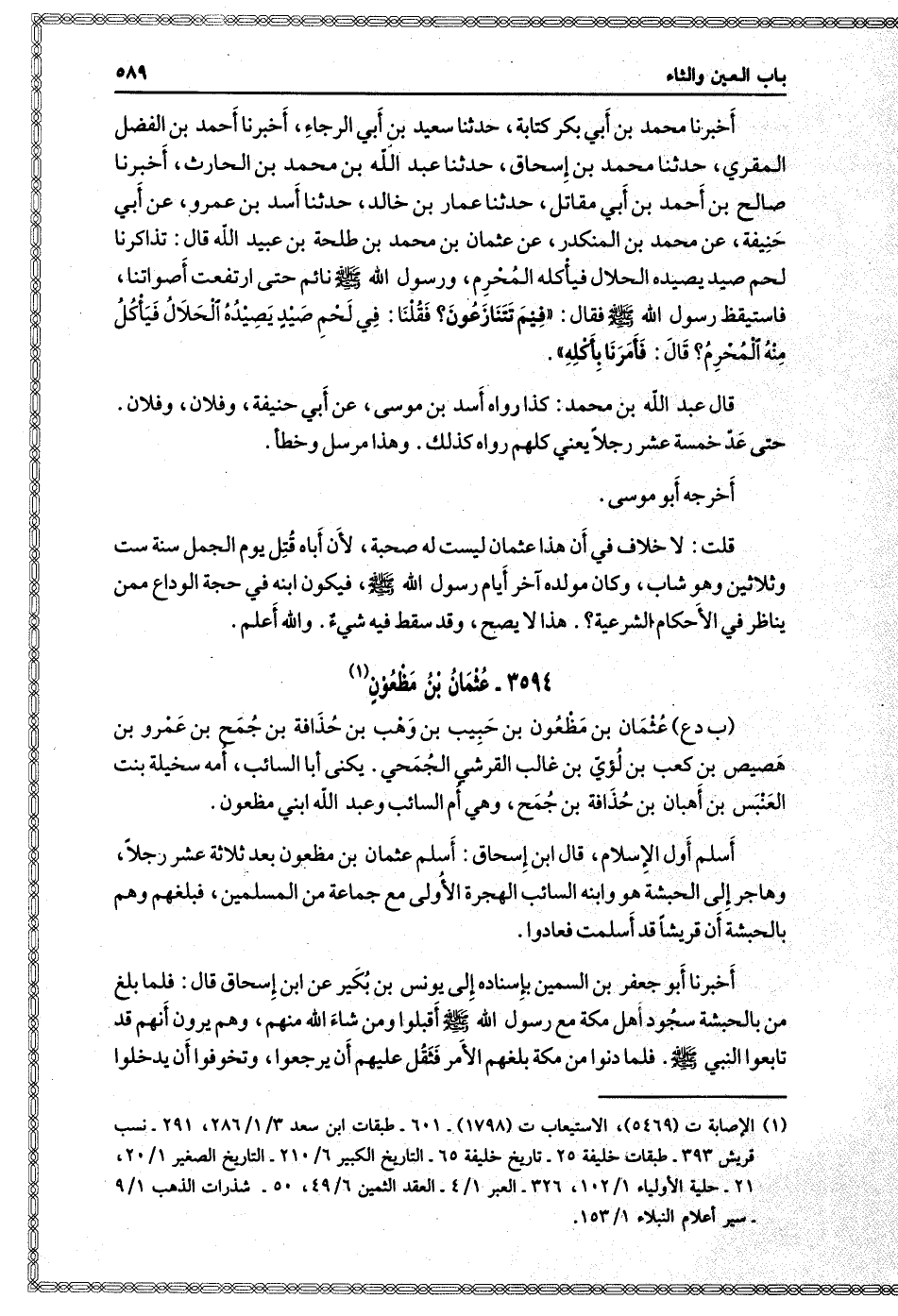 (١٠٢٥) قَالَ ابْنُ إِسْحَاق: فحدثني صالح بْن إِبْرَاهِيم بْن عَبْد الرَّحْمَن بْن عوف، عَنْ أَبِيهِ عمن حدثه، قَالَ: لما رَأَى عثمان ما يلقى رَسُول اللَّه صَلَّى اللَّهُ عَلَيْهِ وَسَلَّمَ وأصحابه من الأذى، وهو يغدو ويروح بأمان الْوَلِيد بْن المغيرة، قَالَ عثمان: والله إن غدوي ورواحي آمنًا بجوار رَجُل من أهل الشرك، وأصحابي وأهل بيتي يلقون البلاء والأذى فِي اللَّه ما لا يصيبني لنقص شديد فِي نفسي، فمضى إِلَى الْوَلِيد بْن المغيرة، فَقَالَ: يا أبا عَبْد شمس، وفت ذمتك، قَدْ كنت فِي جوارك، وَقَدْ أحببت أن أخرج مِنْهُ إِلَى رَسُول اللَّه صَلَّى اللَّهُ عَلَيْهِ وَسَلَّمَ فلي بِهِ وأصحابه أسوة، فَقَالَ الْوَلِيد: فلعلك، يا ابْنُ أخي، أوذيت أَوْ انتهكت؟ قَالَ: لا، ولكن أرضى بجوار اللَّه، ولا أريد أن أستجير بغيره! قَالَ: فانطلق إِلَى المسجد، فاردد عَلَى جواري علانية كما أجرتك علانية! فَقَالَ: انطلق، فخرجا حتَّى أتيا المسجد، فَقَالَ الْوَلِيد: هَذَا عثمان بْن مظعون قَدْ جاء ليرد عليّ جواري، فَقَالَ عثمان: صدق، وَقَدْ وجدته وفيًا كريم الجوار، وَقَدْ أحببت أن لا أستجير بغير اللَّه عَزَّ وَجَلَّ وَقَدْ رددت عليهم جواره، ثُمَّ انصرف عثمان بْن مظعون، ولبيد بْن رَبِيعة بْن جَعْفَر بْن كلاب القيسي فِي مجلس قريش، فجلس معهم عثمان، فَقَالَ لبيد وهو ينشدهم: ألا كل شيء ما خلا اللَّه باطل فَقَالَ عثمان: صدقت، قَالَ لبيد: وكل نعيم لا محالة زائل فَقَالَ عثمان: كذبت، فالتفت القوم إِلَيْه، فقالوا للبيد: أعد علينا، فأعاد لبيد، وأعاد لَهُ عثمان بتكذيبه مرة وبتصديقه مرة، وَإِنما يعني عثمان، إِذَا قَالَ: كذبت، يعني نعيم الجنة لا يزول، فَقَالَ لبيد: والله يا معشر قريش ما كانت مجالسكم هكذا! فقام سفيه منهم إِلَى عثمان ابْنُ مظعون فلطم عينه، فاخضرت، فَقَالَ لَهُ من حوله: والله يا عثمان لقد كنت فِي ذمة منيعة وكانت عينك غنية عما لقيت! فَقَالَ عثمان: جوار اللَّه آمن وأعز وعيني الصحيحة فقرة إِلَى ما لقيت أختها ولي برسول اللَّه صَلَّى اللَّهُ عَلَيْهِ وَسَلَّمَ وبمن آمن معه أسوة، لا فقال الْوَلِيد: هل لك في جواري؟ فقال عثمان: لا أرب لي فِي جوار أحد إلا فِي جوار اللَّه