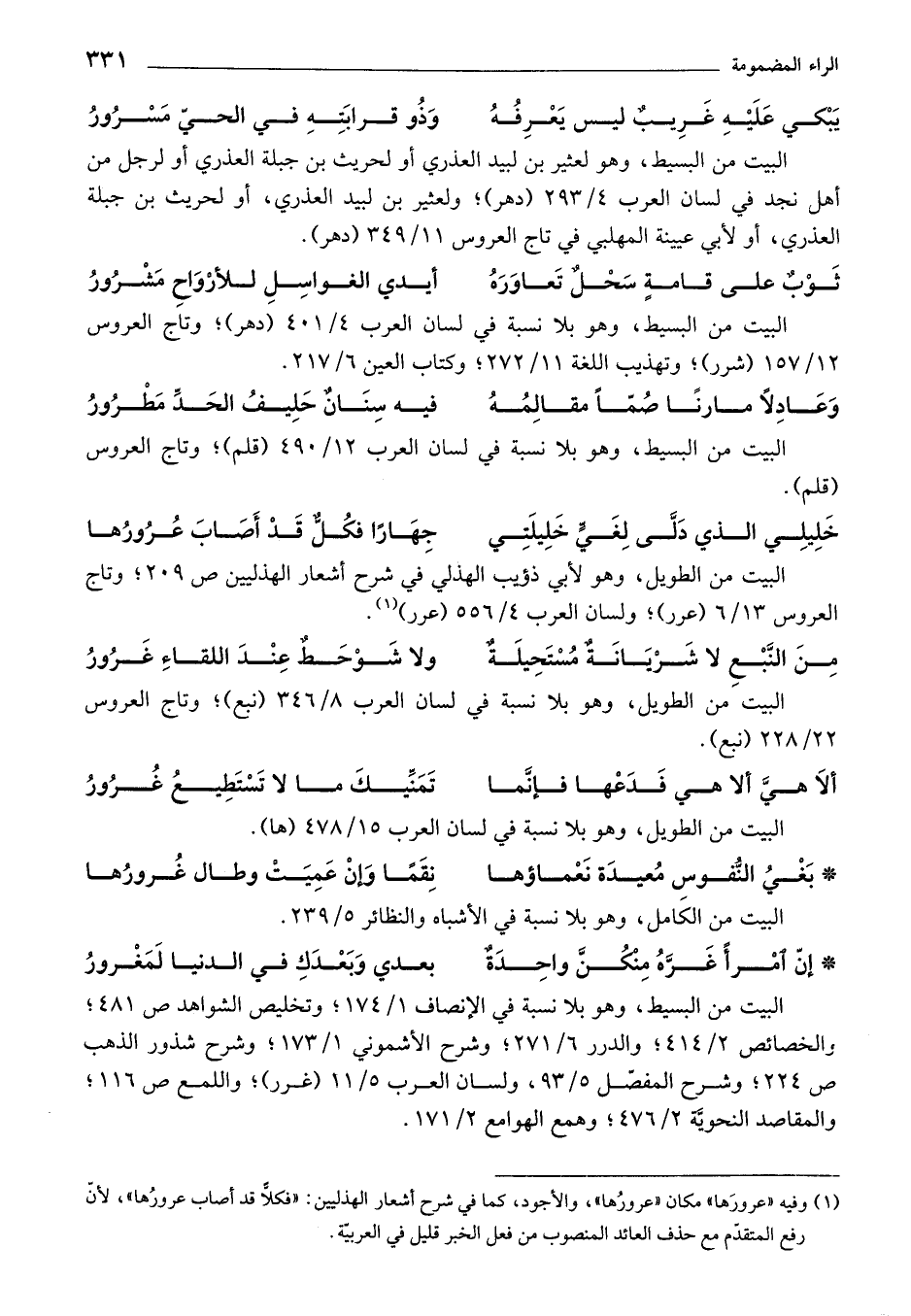 (¬1) وفيه «عرورَها» مكان عرورُها»، والأجود، كما في شرح أشعار الهذليين: «فكلًّا قد أصاب عرورُها»، لن رفع المتقدّم مع حذف العائد المنصوب من فعل الخبر قليل في العربية.
