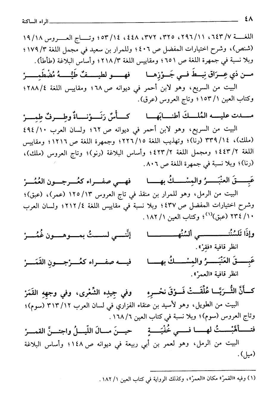 (¬1) وفيه «القمر» مكان «العمر»، وكذلك الرواية في كتاب العين 1/ 182.