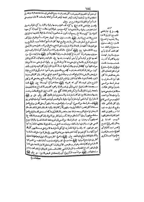 فِيمَا يَقْتَضِي الِانْفِسَاخَ وَالْخِيَارَ فِي الْإِجَارَةِ وَمَا لَا يَقْتَضِيهِمَا (تَنْفَسِخُ) الْإِجَارَةُ (بِتَلَفِ مُسْتَوْفًى مِنْهُ مُعَيَّنٍ) فِي الْعَقْدِ حِسًّا كَانَ التَّلَفُ كَدَابَّةٍ وَأَجِيرٍ مُعَيَّنَيْنِ مَاتَا وَدَارٍ انْهَدَمَتْ، أَوْ شَرْعًا كَامْرَأَةٍ اُكْتُرِيَتْ لِخِدْمَةِ مَسْجِدٍ مُدَّةً فَحَاضَتْ فِيهَا (فِي) زَمَانٍ (مُسْتَقْبَلٍ) لِفَوَاتِ مَحَلِّ الْمَنْفَعَةِ فِيهِ لَا فِي مَاضٍ بَعْدَ الْقَبْضِ إذَا كَانَ لِمِثْلِهِ أُجْرَةٌ لِاسْتِقْرَارِهِ بِهِ فَيَسْتَقِرُّ قِسْطُهُ مِنْ الْمُسَمَّى بِاعْتِبَارِ أُجْرَةِ الْمِثْلِ، فَلَوْ كَانَتْ مُدَّةُ الْإِجَارَةِ سَنَةً، وَمَضَى نِصْفُهَا، وَأُجْرَةُ مِثْلِهِ مِثْلَ أُجْرَةِ النِّصْفِ الْبَاقِي وَجَبَ مِنْ الْمُسَمَّى ثُلُثَاهُ، وَإِنْ كَانَ بِالْعَكْسِ فَثُلُثُهُ وَخَرَجَ بِالْمُسْتَوْفَى مِنْهُ غَيْرُهُ مِمَّا مَرَّ، وَبِالْمُعَيَّنِ فِي الْعَقْدِ الْمُعَيَّنُ عَمَّا فِي الذِّمَّةِ، فَإِنَّ تَلَفَهُمَا لَا يُوجِبُ انْفِسَاخًا بَلْ يُبَدَّلَانِ كَمَا مَرَّ (وَ) تَنْفَسِخُ (بِحَبْسِ غَيْرِ مُكْتِرٍ لَهُ) أَيْ: لِلْعَيْنِ (مُدَّةَ حَبْسِهِ إنْ قُدِّرَتْ بِمُدَّةٍ) سَوَاءٌ أَحَبَسَهُ الْمُكْرِي أَمْ غَيْرُهُ