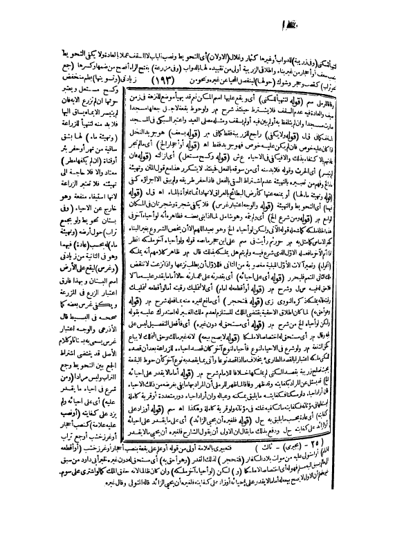 لِتَتَهَيَّأَ لِلسُّكْنَى (وَفِي زَرِيبَةٍ) لِلدَّوَابِّ، أَوْ غَيْرِهَا كَثِمَارٍ وَغِلَالٍ (الْأَوَّلَانِ) أَيْ: التَّحْوِيطُ وَنَصْبُ الْبَابِ لَا السَّقْفُ عَمَلًا بِالْعَادَةِ، وَلَا يَكْفِي التَّحْوِيطُ بِنَصْبِ سَعَفٍ أَوْ أَحْجَارٍ مِنْ غَيْرِ بِنَاءٍ وَإِطْلَاقِي الزَّرِيبَةَ أَوْلَى مِنْ تَقْيِيدِهِ لَهَا بِالدَّوَابِّ (وَفِي مَزْرَعَةٍ) بِفَتْحِ الرَّاءِ أَفْصَحُ مِنْ ضَمِّهَا وَكَسْرِهَا (جَمْعُ نَحْوِ تُرَابٍ) كَقَصَبٍ، وَحَجَرٍ، وَشَوْكٍ (حَوْلَهَا) لِيَنْفَصِلَ الْمُحَيَّا عَنْ غَيْرِهِ، وَنَحْوِ مِنْ زِيَادَتِي.