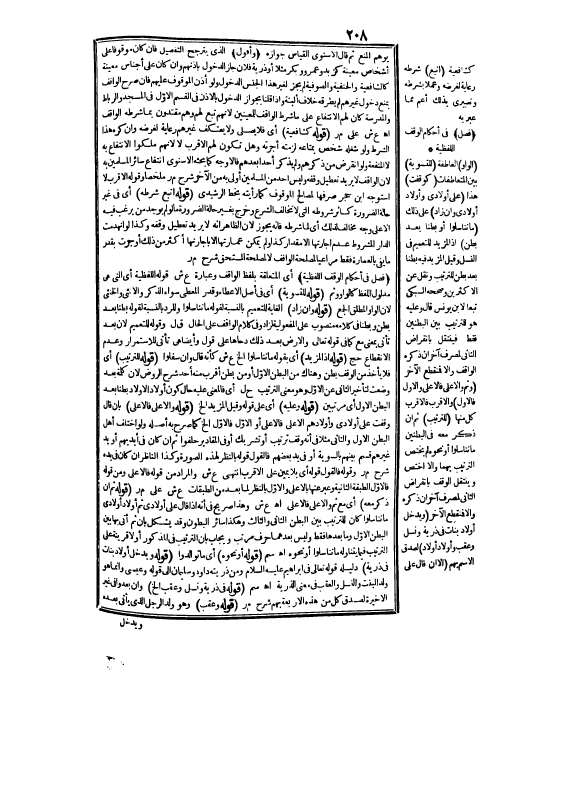 (فَصْلٌ) فِي أَحْكَامِ الْوَقْفِ اللَّفْظِيَّةِ (الْوَاوُ) الْعَاطِفَةُ (لِلتَّسْوِيَةِ) بَيْنَ الْمُتَعَاطِفَاتِ (كَوَقَفْتُ) هَذَا (عَلَى أَوْلَادِي وَأَوْلَادِ أَوْلَادِي وَإِنْ زَادَ) عَلَى ذَلِكَ (مَا تَنَاسَلُوا أَوْ بَطْنًا بَعْدَ بَطْنٍ) إذْ الْمَزِيدُ لِلتَّعْمِيمِ فِي النَّسْلِ وَقِيلَ الْمَزِيدُ فِيهِ بَطْنًا بَعْدَ بَطْنٍ لِلتَّرْتِيبِ، وَنُقِلَ عَنْ الْأَكْثَرِينَ وَصَحَّحَهُ السُّبْكِيُّ تَبَعًا لِابْنِ يُونُسَ قَالَ: وَعَلَيْهِ هُوَ لِلتَّرْتِيبِ بَيْنَ الْبَطْنَيْنِ فَقَطْ فَيَنْتَقِلُ بِانْقِرَاضِ الثَّانِي لِمَصْرِفٍ آخَرَ إنْ ذَكَرَهُ الْوَاقِفُ وَإِلَّا فَمُنْقَطِعُ الْآخِرِ.