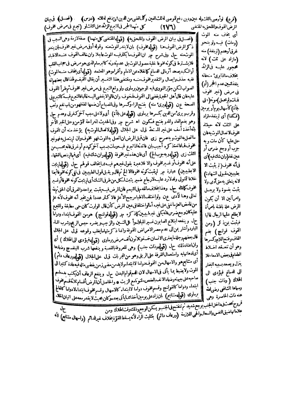 فِي بَيَانِ الْمَرَضِ الْمَخُوفِ وَالْمُلْحَقِ بِهِ الْمُقْتَضِي كُلٌّ مِنْهُمَا الْحَجْرَ فِي التَّبَرُّعِ الزَّائِدِ عَلَى الثُّلُثِ. لَوْ (تَبَرَّعَ فِي مَرَضٍ مَخُوفٍ) أَيْ يُخَافُ مِنْهُ الْمَوْتُ (وَمَاتَ) فِيهِ وَلَوْ بِنَحْوِ غَرَقٍ، أَوْ هَدْمٍ (لَمْ يَنْفُذْ) مِنْهُ (مَا زَادَ عَلَى الثُّلُثِ) ؛ لِأَنَّهُ مَحْجُورٌ عَلَيْهِ فِي الزَّائِدِ بِخِلَافِ مَا إذَا بَرَأَ مِنْهُ فَإِنَّهُ يَنْفُذُ لِتَبَيُّنِ عَدَمِ الْحَجْرِ (أَوْ) فِي مَرَضٍ (غَيْرِ مَخُوفٍ فَمَاتَ وَلَمْ يُحْمَلْ) مَوْتُهُ (عَلَى فَجْأَةٍ) كَإِسْهَالِ يَوْمٍ، أَوْ يَوْمَيْنِ (فَكَذَا) أَيْ لَمْ يَنْفُذْ مَا زَادَ عَلَى الثُّلُثِ؛ لِأَنَّهُ حِينَئِذٍ مَخُوفٌ لِاتِّصَالِ الْمَوْتِ بِهِ فَإِنْ حُمِلَ عَلَيْهَا كَأَنْ مَاتَ وَبِهِ جَرَبٌ، أَوْ وَجَعُ ضِرْسٍ أَوْ عَيْنٍ نَفَذَ (وَإِنْ شُكَّ فِيهِ) أَيْ فِي أَنَّهُ مَخُوفٌ (لَمْ يَثْبُتْ إلَّا بِطَبِيبَيْنِ مَقْبُولَيْ الشَّهَادَةِ) ؛ لِأَنَّهُ يَتَعَلَّقُ بِهِ حَقُّ آدَمِيٍّ وَلَا يَثْبُتُ بِنِسْوَةٍ وَلَا بِرَجُلٍ وَامْرَأَتَيْنِ إلَّا أَنْ يَكُونَ الْمَرَضُ عِلَّةً بَاطِنَةً بِامْرَأَةٍ لَا يَطَّلِعُ عَلَيْهَا الرِّجَالُ غَالِبًا فَيَثْبُتُ بِمَنْ ذُكِرَ (وَمِنْ الْمَخُوفِ قُولَنْجُ) بِضَمِّ الْقَافِ وَفَتْحِ اللَّامِ وَكَسْرِهَا وَهُوَ أَنْ تَنْعَقِدَ أَخْلَاطُ الطَّعَامِ فِي بَعْضِ الْأَمْعَاءِ فَلَا يَنْزِلُ وَيَصْعَدُ بِسَبَبِهِ الْبُخَارُ إلَى الدِّمَاغِ فَيُؤَدِّيَ إلَى الْهَلَاكِ (وَذَاتُ جَنْبٍ) وَسَمَّاهَا الشَّافِعِيُّ - رَضِيَ اللَّهُ عَنْهُ - ذَاتَ الْخَاصِرَةِ وَهِيَ قُرُوحٌ تَحْدُثُ فِي دَاخِلِ الْجَنْبِ بِوَجَعٍ شَدِيدٍ، ثُمَّ تَنْفَتِحُ فِي الْجَنْبِ وَيَسْكُنُ الْوَجَعُ وَذَلِكَ وَقْتَ الْهَلَاكِ وَمِنْ عَلَامَاتِهَا ضِيقُ النَّفَسِ وَالسُّعَالُ وَالْحُمَّى اللَّازِمَةُ (وَرُعَافٌ دَائِمٌ) بِتَثْلِيثِ الرَّاءِ؛ لِأَنَّهُ يُسْقِطُ الْقُوَّةَ بِخِلَافِ غَيْرِ الدَّائِمِ (وَإِسْهَالٌ مُتَتَابِعٌ)