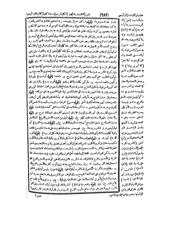 (قَوْلُهُ: لِأَقْرَبِ أَقَارِبِهِ) ، أَيْ زَيْدٍ م ر (قَوْلُهُ: فَهُوَ لِذُرِّيَّتِهِ فَأُبُوَّةٌ) اُسْتُشْكِلَ بِأَنَّ الْأَبَوَيْنِ وَالْوَلَدَ لَا يَدْخُلَانِ فِي الْأَقَارِبِ فَكَيْفَ يَدْخُلَانِ فِي أَقْرَبِ الْأَقَارِبِ.؟