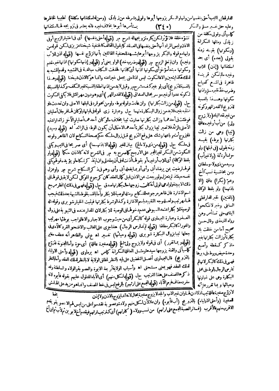 وَلِخَبَرِ الدَّارَقُطْنِيِّ: «الثَّيِّبُ أَحَقُّ بِنَفْسِهَا مِنْ وَلِيِّهَا، وَالْبِكْرُ يُزَوِّجُهَا أَبُوهَا» وَقَوْلِي: بِشَرْطِهِ مِنْ زِيَادَتِي. (وَسُنَّ لَهُ اسْتِئْذَانُهَا مُكَلَّفَةً) تَطْيِيبًا لِخَاطِرِهَا وَعَلَيْهِ حُمِلَ خَبَرُ مُسْلِمٍ «، وَالْبِكْرُ يَسْتَأْمِرُهَا أَبُوهَا» بِخِلَافِ غَيْرِهِ فَإِنَّهُ يُعْتَبَرُ فِي تَزْوِيجِهِ لَهَا اسْتِئْذَانُهَا، كَمَا سَيَأْتِي. وَقَوْلِي: مُكَلَّفَةً مِنْ زِيَادَتِي وَمِثْلُهَا السَّكْرَانَةُ (وَسُكُوتُهَا) بِقَيْدٍ زِدْته بِقَوْلِي: (بَعْدَهُ) أَيْ: بَعْدَ اسْتِئْذَانِهَا (إذْنٌ) لِلْأَبِ وَغَيْرِهِ مَا لَمْ تَكُنْ قَرِينَةٌ ظَاهِرَةٌ فِي الْمَنْعِ كَصِيَاحٍ وَضَرْبِ خَدٍّ لِخَبَرِ مُسْلِمٍ: «وَإِذْنُهَا سُكُوتُهَا» وَهَذَا بِالنِّسْبَةِ لِلتَّزْوِيجِ لَا لِقَدْرِ الْمَهْرِ، وَكَوْنِهِ مِنْ غَيْرِ نَقْدِ الْبَلَدِ (وَلَا يُزَوِّجُ وَلِيٌّ) مِنْ أَبٍ، أَوْ غَيْرِهِ عَاقِلَةً (ثَيِّبًا) وَهِيَ مَنْ زَالَتْ بَكَارَتُهَا (بِوَطْءٍ) بِقَيْدٍ زِدْته بِقَوْلِي: (فِي قُبُلِهَا) ، وَلَوْ حَرَامًا، أَوْ نَائِمَةً (وَلَا غَيْرُ أَبٍ) وَسَيِّدٍ مِنْ ذِي وَلَاءٍ وَسُلْطَانٍ، وَمَنْ بِحَاشِيَةِ نَسَبٍ كَأَخٍ وَعَمٍّ (بِكْرًا) عَاقِلَةً (إلَّا بِإِذْنِهِمَا) ، وَلَوْ بِلَفْظِ الْوَكَالَةِ (بَالِغَتَيْنِ) ؛ لِخَبَرِ الدَّارَقُطْنِيِّ السَّابِقِ وَخَبَرِ «لَا تُنْكِحُوا الْيَتَامَى حَتَّى تَسْتَأْمِرُوهُنَّ» رَوَاهُ التِّرْمِذِيُّ وَقَالَ حَسَنٌ صَحِيحٌ.