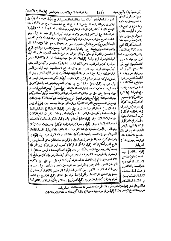 (بِلَا إذْنٍ) فِي الْجَمِيعِ فَإِنْ سَافَرَ بِهِ أَوْ أَبْضَعَهُ بِلَا إذْنٍ ضَمِنَ أَوْ بَاعَ بِشَيْءٍ مِنْ الْبَقِيَّةِ بِلَا إذْنٍ صَحَّ فِي نَصِيبِهِ فَقَطْ وَانْفَسَخَتْ الشَّرِكَةُ فِي الْمَبِيعِ وَصَارَ مُشْتَرَكًا بَيْنَ الْمُشْتَرِي وَالشَّرِيكِ، وَتَعْبِيرِي بِمَصْلَحَةٍ أَوْلَى مِنْ قَوْلِهِ بِلَا ضَرَرٍ لِاقْتِضَائِهِ جَوَازَ الْبَيْعِ بِثَمَنِ الْمِثْلِ مَعَ رَاغِبٍ بِزِيَادَةٍ وَمِنْ قَوْلِ الْمُحَرَّرِ بِغِبْطَةٍ لِاقْتِضَائِهِ الْمَنْعَ مِنْ شِرَاءِ مَا يَتَوَقَّعُ رِبْحَهُ إذْ الْغِبْطَةُ إنَّمَا هِيَ تَصَرُّفٌ فِيمَا فِيهِ رِبْحٌ عَاجِلٌ لَهُ بَالٌ