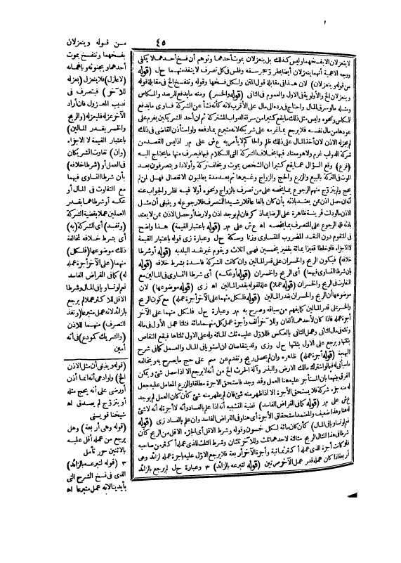 وَعِبَارَةُ ح ل فَلِكُلٍّ مِنْهُمَا عَلَى الْآخَرِ أُجْرَةُ عَمَلِهِ فَإِذَا كَانَ لِأَحَدِهِمَا أَلْفَانِ وَلِلْآخَرِ أَلْفٌ، وَأُجْرَةُ عَمَلِ كُلٍّ مِنْهُمَا مِائَةٌ، فَثُلُثَا عَمَلِ الْأَوَّلِ فِي مَالِهِ وَثُلُثُهُ فِي مَالِ الثَّانِي وَعَمَلُ الثَّانِي بِالْعَكْسِ فَلِلْأَوَّلِ عَلَيْهِ ثُلُثُ الْمِائَةِ، وَلَهُ عَلَى الْأَوَّلِ ثُلُثَاهَا فَيَقَعُ التَّقَاصُّ بِثُلُثِهَا وَيَرْجِعُ عَلَى الْأَوَّلِ بِثُلُثِهَا ح ل وزي يَتَقَاصَّانِ إنْ اسْتَوَيَا فِي الْمَالِ وَالْعَمَلِ كَمَا فِي شَرْحِ الْبَهْجَةِ.