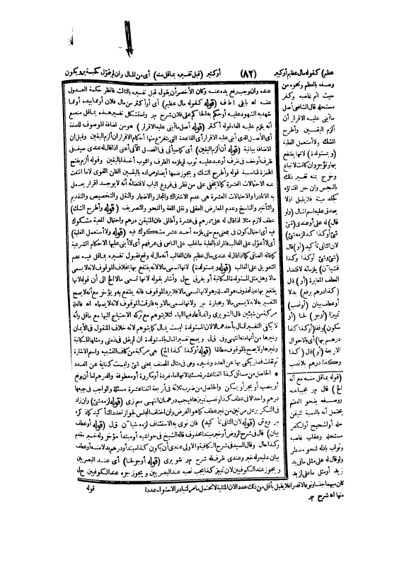 . (قَوْلُهُ: كَقَوْلِهِ: مَالٌ عَظِيمٌ) أَيْ أَوْ أَكْثَرُ مِنْ مَالِ فُلَانٍ أَوْ مِمَّا بِيَدِهِ أَوْ مِمَّا شَهِدَ بِهِ الشُّهُودُ عَلَيْهِ أَوْ حَكَمَ بِهِ الْحَاكِمُ عَلَى فُلَانٍ شَرْحُ م ر وَاسْتَشْكَلَ تَفْسِيرُ هَذِهِ بِمَا قَلَّ مِنْهُ مَعَ أَنَّهُ يَلْزَمُ عَلَيْهِ إلْغَاءُ قَوْلِهِ: أَكْثَرُ. (قَوْلُهُ: أَصْلُ مَا أَبْنِي عَلَيْهِ الْإِقْرَارَ) هُوَ مِنْ إضَافَةِ الْمَوْصُوفِ لِلصِّفَةِ أَيْ: الْأَصْلُ الَّذِي أَبْنِي عَلَيْهِ الْإِقْرَارَ أَيْ: الْقَاعِدَةُ الَّتِي يَتَفَرَّعُ مِنْهَا أَحْكَامُ الْإِقْرَارِ أَنْ أُلْزِمَ الْيَقِينَ وَقِيلَ: إنَّ الْإِضَافَةَ بَيَانِيَّةٌ. (قَوْلُهُ: أَنْ أَلْزَمَهُ الْيَقِينَ) أَيْ:، كَمَا سَيَأْتِي فِي الْفَصْلِ الْآتِي أَعْنِي إذَا قَالَ: لَهُ عِنْدِي سَيْفٌ فِي ظَرْفٍ أَوْ خُفٌّ فِي ظَرْفٍ أَوْ عَبْدٌ عَلَيْهِ ثَوْبٌ لَمْ يَلْزَمْهُ الظَّرْفُ وَالثَّوْبُ أَخْذًا بِالْيَقِينِ وَقَوْلُهُ: أَلْزَمَ بِفَتْحِ الْهَمْزَةِ لِمُنَاسَبَةِ قَوْلِهِ: وَأَطْرَحَ الشَّكَّ وَيَجُوزُ ضَمُّهَا أَيْضًا، وَمُرَادُهُ بِالْيَقِينِ الظَّنُّ الْقَوِيُّ لَا مَا انْتَفَتْ عَنْهُ الِاحْتِمَالَاتُ الْعَشَرَةُ، كَمَا لَا يَخْفَى عَلَى مَنْ نَظَرَ فِي فُرُوعِ الْبَابِ لِاقْتِضَائِهِ أَنَّهُ لَا يُوجَدُ إقْرَارٌ يُعْمَلُ بِهِ إلَّا نَادِرًا وَالِاحْتِمَالَاتُ الْعَشَرَةُ هِيَ: عَدَمُ الِاشْتِرَاكِ وَالْمَجَازُ وَالْإِضْمَارُ وَالنَّقْلُ وَالتَّخْصِيصُ وَالتَّقْدِيمُ وَالتَّأْخِيرُ وَالنَّاسِخُ وَعَدَمُ الْمُعَارِضِ الْعَقْلِيِّ وَنَقْلُ اللُّغَةِ وَالنَّحْوُ وَالتَّصْرِيفُ. (قَوْلُهُ: وَأَطْرَحَ الشَّكَّ) عَطْفُ لَازِمٍ مَثَلًا إذَا قَالَ لَهُ: عَلَيَّ دِرْهَمٌ فِي عَشْرَةٍ وَأَطْلَقَ فَإِنَّ الْمُتَيَقَّنَ دِرْهَمٌ وَاحْتِمَالُ الْمَعِيَّةِ مَشْكُوكٌ فِيهِ أَيْ: احْتِمَالُ كَوْنِ " فِي " بِمَعْنَى مَعَ حَتَّى يَلْزَمَهُ أَحَدَ عَشَرَ مَشْكُوكٌ فِيهِ.