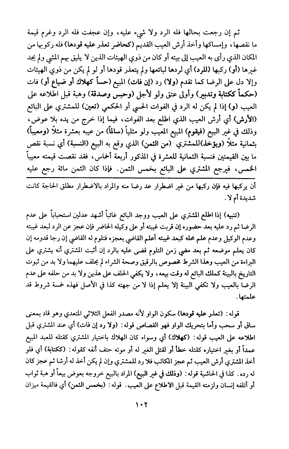 تنبيه : إذا اطلع المشتري على العيب ووجد البائع غائباً أشهد عدلين استحباباً على عدم الرضا . ثم رد عليه بعد حضوره إن قربت غيبته أو على وكيله الحاضر ، فإن عجز عن الرد لبعد غيبته وعدم الوكيل وعدم محله كبعد غيبته أعلم القاضي بعجزه فتلوم له القاضي إن رجا قدومهكأن لم يعلم موضعه ثم بعد مضي زمن التلوم قضي عليه بالرد إن أثبت المشتري أنه لم يشتر على البراءة من العيب . وهذا الشرط مخصوص بالرقيق وصحة الشراء إن لم يحلف عليهما . ولابد من ثبوت التاريخ بالبينة كملك البائع له لوقت بيعه ، ولا يكفي الحلف على هذين . ولابد من حلفه على عدم الرضا بالعيب . ولا تكفي فيه البينة إذ لا يعلم إلا من جهته كذا في الأصل ؛ فهذه خمسة شروط قد علمتها .