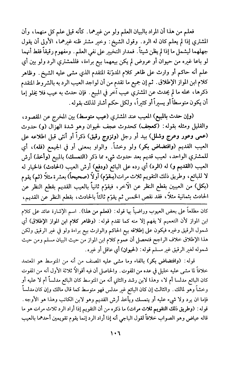 قوله : 16 ( وطريق ذلك التقويم ثلاث مرات ) : ما ذكره من أن التقويم إذا أراد ثلاث مرات ، وهو ما قاله عياض ، وهو الصواب . خلافاً لقول الباجي : إنه إذا أراد الرد إنما يقوم تقويمين أحدهما بالعيب