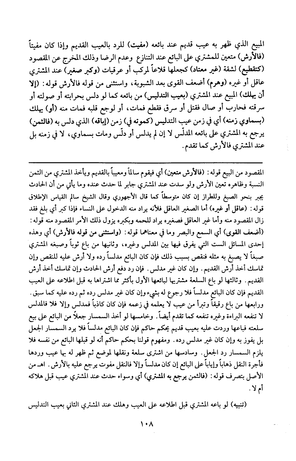قوله : 16 ( واستثنى من قوله فالأرش ) : أي وهذه إحدى المسائل الست التي يفرق فيها بين المدلس وغيره . وثانيها : من باع ثوباً وصبغه المشتري صبغاً لا يصبغ مثله فنقص بسبب ذلك فإن كان البائع مدلساً رده ولا أرش عليه للنقص ، وإن تماسك أخذ أرش القديم وإن كان غير مدلس ، فإن رد دفع أرش الحادث وإن تماسك أخذ أرش القديم ، وثالثها : لو باع السلعة مشتريها لبائعها الأول بأكثر مما اشتراها به قبل اطلاعه على العيب القديم ، فإن كان البائع مدلساً فلا رجوع له بشيء وإن كان غير مدلس رده ثم رد عليه كما سبق . ورابعها : من باع رقيقاً وتبرأ من عيب لا يعلمه في زعمه ، فإن كان كاذباً فمدلس ، وإلا فلا . فالمدلس لاتنفعه البراءة وغيره تنفعه كما تقدم أيضاً . وخامسها : لو أخذ السمسار جعلاً من البائع على بيع سلعته فباعها وردت عليه بعيب قديم بحكم حاكم فإن البائع مدلساً فلا يرد السمسار الجعل بل يفوز به وإن كان غير مدلس رده . ومفهوم قولنا بحكم حاكم أنه لو قبلها البائع من نفسه فلا يلزم السمسار رد الجعل . وسادسها : من اشترى سلعة ونقلها لموضع ثم ظهر له بها عيب وردها فأجرة النقل ذهاباً وإياباً على البائع إن كان مدلساً ، وإلا فالنقل مفوت يرجع عليه بالأرش ( اه من الأصل بتصريف ) .