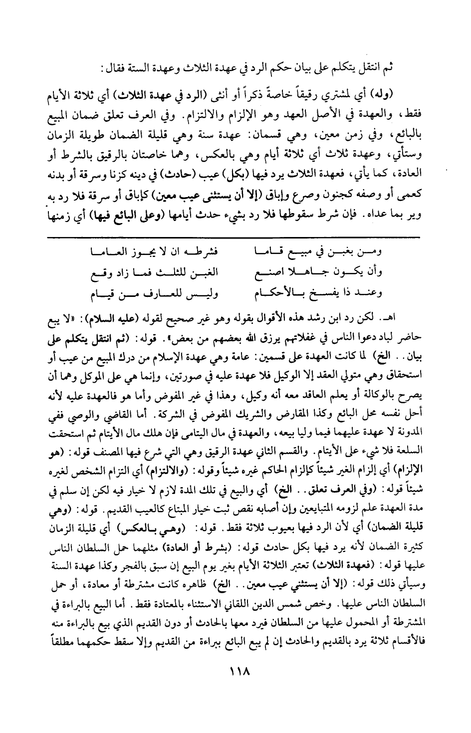 قوله : 16 ( فعهدة الثلاث ) : تعتبر الثلاثة الأيام بغير يوم البيع إن سبق بالفجر وكذا عهدة السنة وسيأتي ذلك .