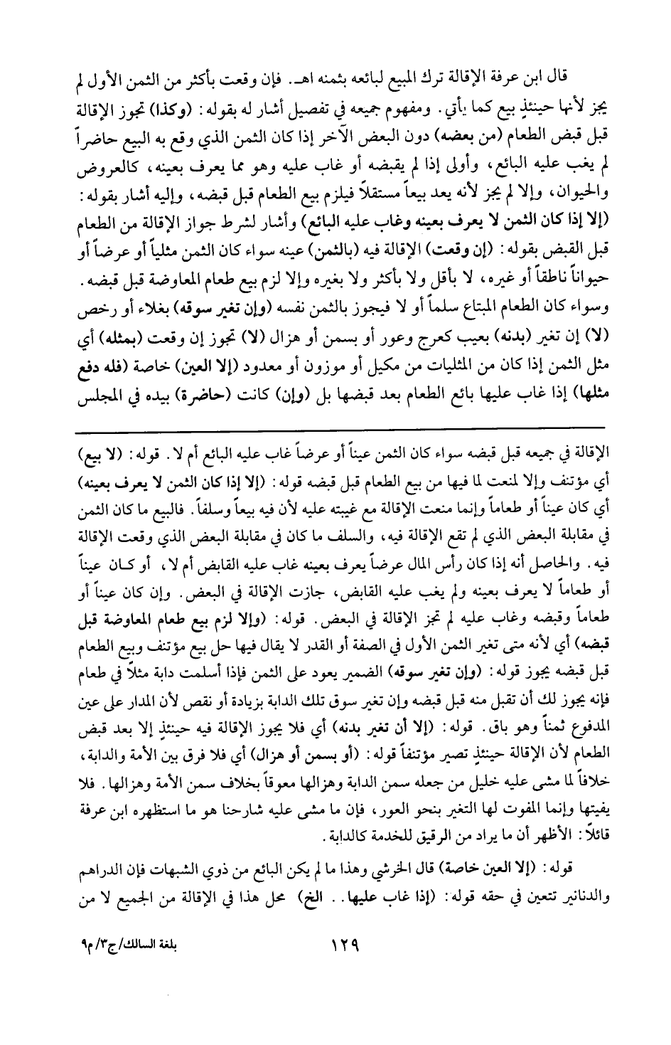 قوله : 16 ( وإن تغير سوقه ) : الضمير يعود على الثمن فإذا أسلمت دابة مثلاً في طعام فإنه يجوز لك أن تقيل منه قبل قبضه وإن تغير سوق تلك الدابة بزيادة أو نقص لأن المدار على عين المدفوع ثمناً وهو باق . .