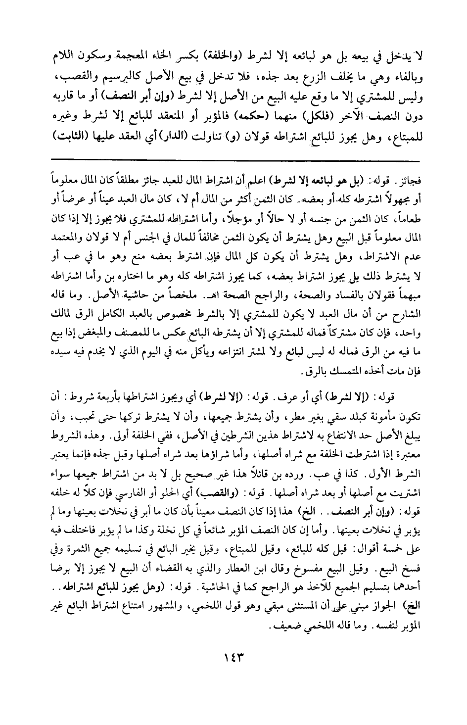 قوله : 16 ( إلا لشرط ) : وبجوز اشتراطها باربعة شروط : ان تكون مأمونة كبلد سقى بغير مطر ، وأن يشترط جميعها وألا يشترط تركها حتى تحبب ، وأن يبلغ الأصل حدّ الانتفاع به لاشتراط هذين الشرطين في الأصل ، ففي الخلفة أولى وهذه الشروط معتبرة إذا اشترطت الخلفة مع شراء أصلها وأما شراؤها بعد شراء أصلها وقبل جذه فإنما يعتبر الشرط الأول . كذا في ( رعب ) . ورده ( بن ) قائلاً : هذا غير صحيح ، بل لا بد من اشتراط جميعها سواء اشتريت مع أصلها أو بعد شراء أصلها .