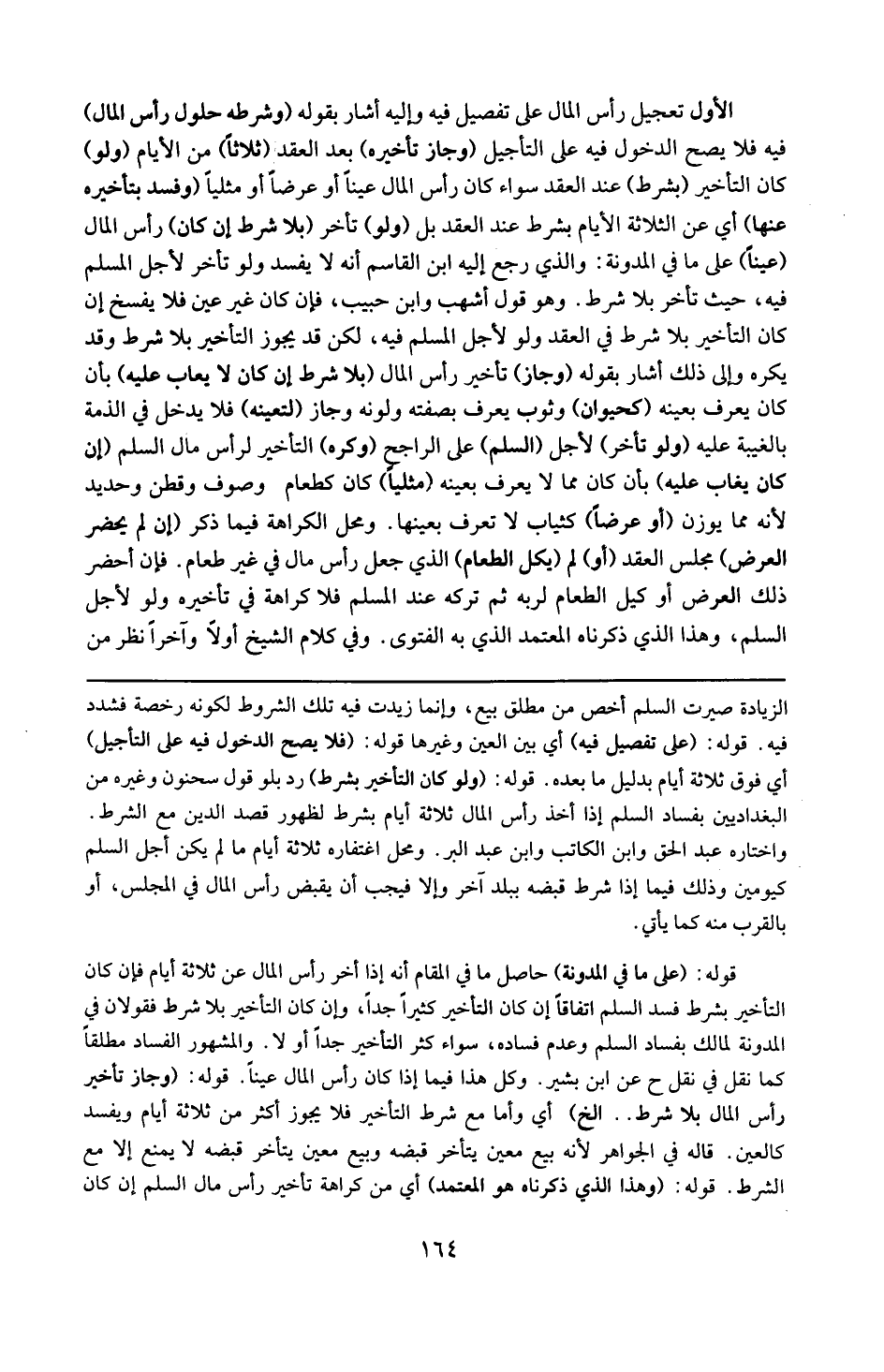 قوله : 16 ( ولو كان التأخير بشرط ) : ردّبلو قول سحنون وغيره من البغداديين بفساد السلم إذات اخر رأس المال ثلاثة أيام بشرط لظهور قصد الدين مع الشرط ، واختاره عبد الحق و ابن الكاتب و ابن عبد البر ، ومحل اغتفاره ثلاثة أيام ما لم يكن أجل السلم كيومين ، وذلك فيما إذا شرط قبضه ببلد آخر ، وإلا فيجب ان يقبض رأس المال في المجلس أو بالقرب منه كما يأتي .