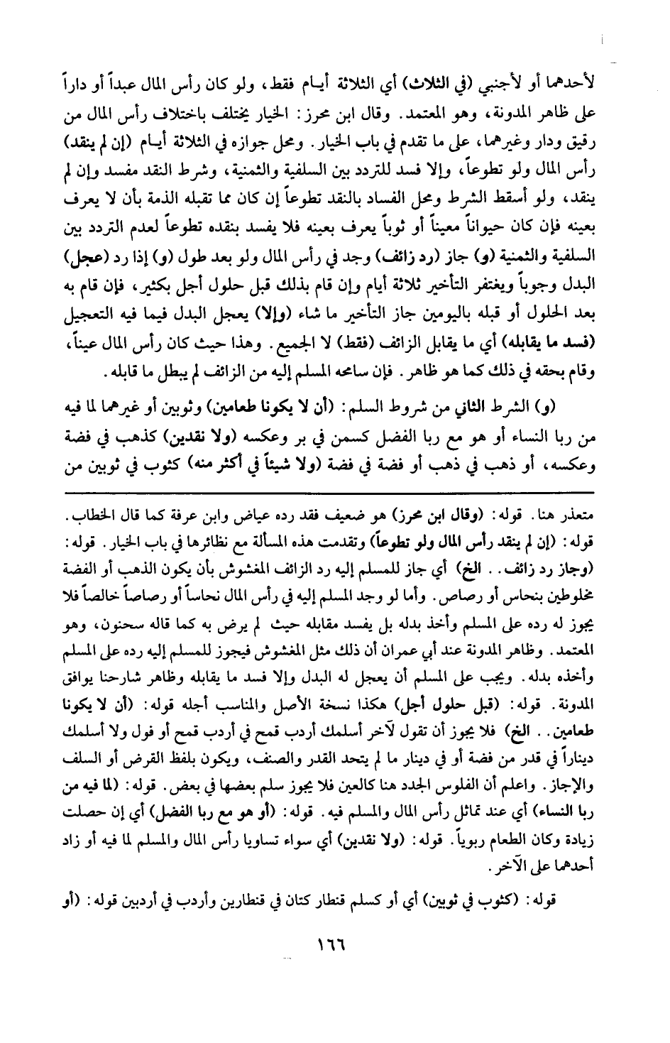قوله : 16 ( ألاّ يكونا طعامين ) إلخ : فلا يجوز ان تقول لآخر أسلمك إردب قمح في إردب قمح أو فول ولا أسلمك ديناراً في قدر من فضة أو في دينار ما لم يتحد القدر والصنف ويكون بلفظ القرض أو السلف وإلا جاز . واعلم أن الفلوس الجدد هنا كالعين فلا يجوز سلم بعضها في بعض .