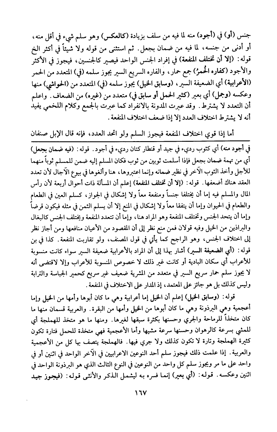 قوله : 6 ( أي الضعيفة السير ) : أشرا بهذا إلى ان المراد بالأعرابية ضعيفة السير سواء كانت منسوبة للأعراب أي سكان البادية أو كانت غير ذلك لا خصوص المنسوبة للأعراب ، وإلا لاقتضى أنه لايجوز سلم حمار سريع السير في متعدد من المصرية ضعيف غير سريع كحمير الجباسة والترابة ، وليس كذلك ، بل هو جائز على المعتمد إذ المدار على الاختلاف في المنفعة .