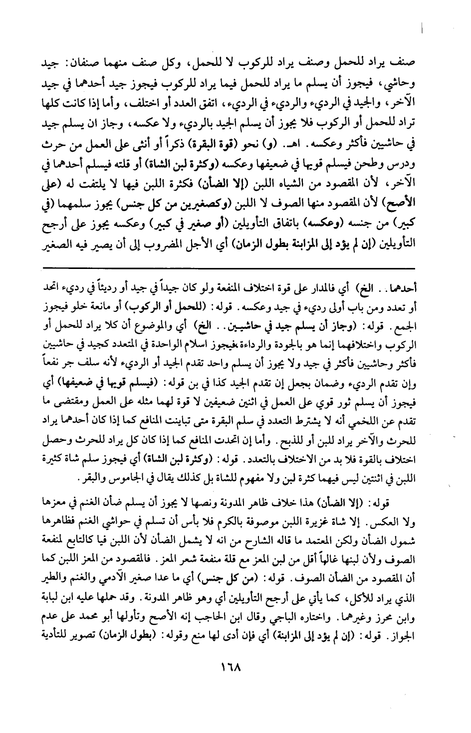 قوله : 6 ( إلا الضأن ) : هذا خلاف ظاهر المدونة ، ونصها : ولايجوز أن يسلم ضأن الغنم في معزها ولا العكس إلا شاة غزيرة اللبن موصوفة بالكرم فلا بأس أن تسلم في حواشي الغنم ؛ فظاهرها شمول الضأن ولكن المعتمد ما قاله الشارح من أنه لايشمل الضأن ، لأن اللبن فيها كالتابع لمنفعة الصوف ، ولأن لبنها غالباً أقل من لبن المعز مع قلة منفعة شعر المعز . فالمقصود من المعز اللبن كما ان المقصود من الضأن الصوف .