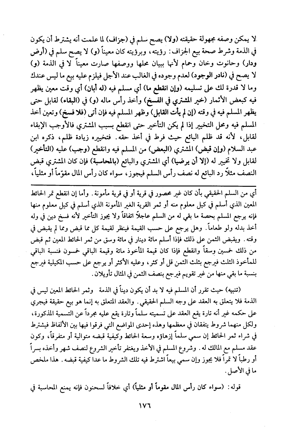 تنبيه : حيث تقرر ان المسلم فيه لابد ان يكون ديناً في الذمة ، وثمر الحائط المعين ليس في الذمة ، فلا يتعلق به العقد على وجه السلم الحقيقي . والعقد المتعلق به ، إنما هو بيع حقيقة فيجري على حكمه ، غير انه تارة يقع العقد على تسميته سلماً وتارة يقع عليه مجردا عن التسمية المذكورة ولكل منهما شروط يتفقان في معظمها . وهذه إحدى المواضع التي فرقوا فيها بين الألفاظ ، فيشترط في شراء ثمر الحائط إن سمي سلماً إزهاؤه وسعة الحائط وكيفية قبضه متوالياً أو متفرقاً ، وكون عقد السلم مع المالك وشروع المسلم في الأخذ ويغتفر تأخير الشروع لنصف شهر وأخذه بسراً أو رطباً لا تمراً فلا يجوز . وإن سمي بيعا : اشترط فيه تلك الشروط ما عدا كيفية قبضه هذا ملخص ما في الأصل .