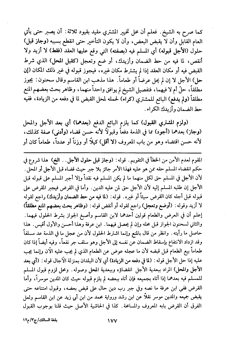قوله : 16 ( وجاز قبل حلول الأجل ) إلأخ : هذا شروع في حكم اقتضاء السلم حقه ممن هو عليه فهذا الامر جائز بلا جبر حيث قضاه قبل الأجل أو المحل لأن الاجل في المسلم حق لكل منهما ما لم يكن المسلم فيه نقداً ، وإا أجبر المسلم على قبوله قبل الاجل إن طلبه المسلم إلأيه لأن الأجل حق لمن عليه الدين وأما في القرض فيجبر على قبوله قبل أجله كان القرض عيناً أو غيره .