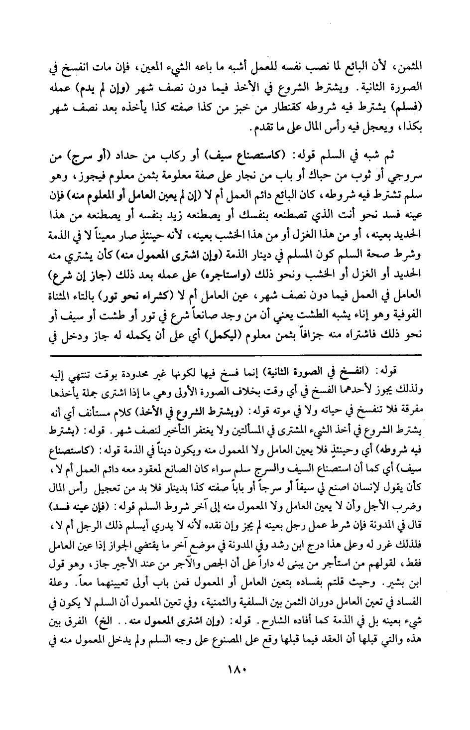 قوله : 16 ( كاستصناع سيف ) : أي كما ان استصناع السيف والسرج سلم سواء كان الصانع المعقود معه دائم العمل أم لا كأن يقول لأنسان : اصنع لي سيفاً أو سرجاً أو باباً صفته كذا بدينار ، فلا بد من تعجيل رأس المال وضرب الأجل وأن لا يعين العامل ولا المعمول منه إلى آخر شروط السلم .